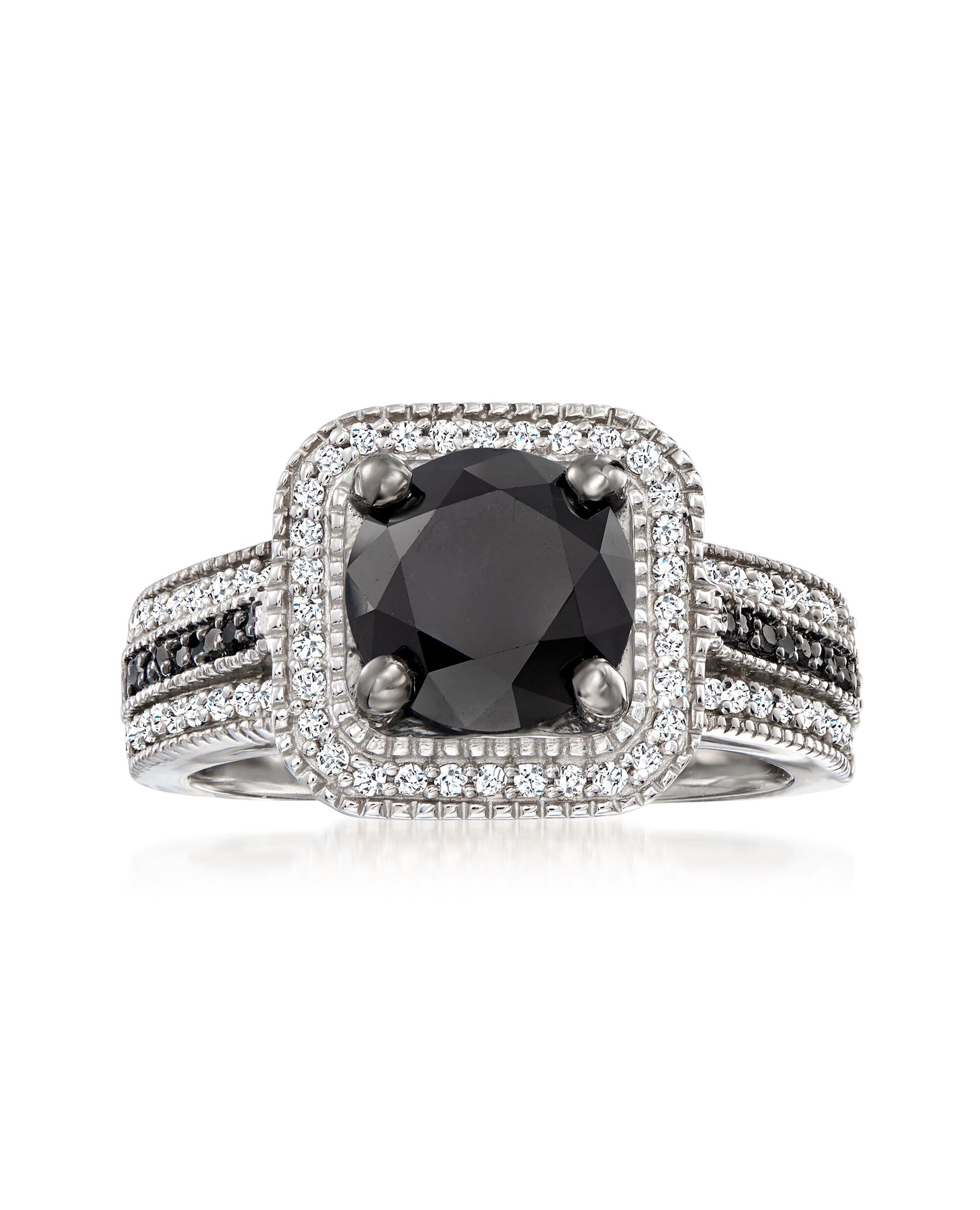 Ross-Simons is always looking for new ways to reinvent essential jewelry styles. A classic diamond look is made modern with a high-contrast palette of black and white. This ring boasts a 2.60 carat round black diamond in a haloed three-row setting of .40 ct. t.w. black and white diamonds. Set in sterling silver. White and black diamond ring. Each Ross-Simons item arrives in a fine jewelry presentation box. Shop Ross-Simons jewelry risk-free as all items include a 30-day, 100% money-back guarantee.Stone InformationGem Type 1 - DiamondStone Cut 1 - Good-CutStone Color 1 - BlackStone Clarity 1 - BlackStone Shape 1 - Round-ShapeStone Creation Method 1 - NaturalStone Treatment Method 1 - Not-TreatedStone Weight 1 - 2.60 CaratsNumber Of Stones 1 - 1Gem Type 2 - DiamondStone Cut 2 - Good-CutStone Color 2 - I-JStone Clarity 2 - I3Stone Shape 2 - Round-ShapeStone Creation Method 2 - NaturalStone Treatment Method 2 - Not-TreatedStone Weight 2 - 0.30 CaratsNumber Of Stones 2 - 68Gem Type 3 - DiamondStone Cut 3 - Good-CutStone Color 3 - BlackStone Clarity 3 - BlackStone Shape 3 - Round-ShapeStone Creation Method 3 - NaturalStone Treatment Method 3 - Not-TreatedStone Weight 3 - 0.10 CaratsNumber Of Stones 3 - 20