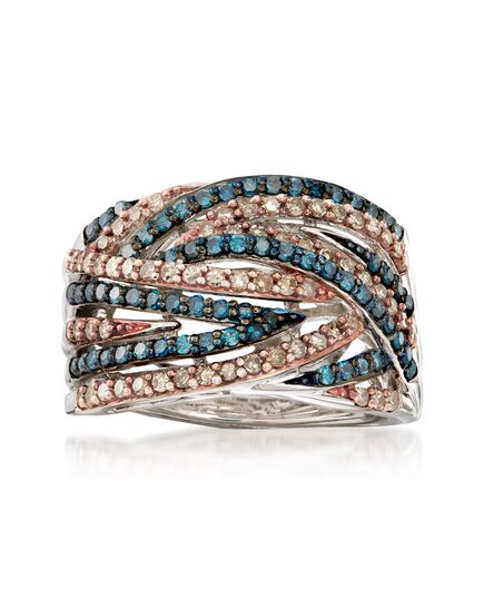 Ross-Simons travels the world to find beautiful, high-quality styles at the best prices. This swirling highway ring makes the perfect complement to your cocktail party dress! .50 ct. t.w. blue diamonds interlock with .50 ct. t.w. champagne diamonds in polished sterling silver with blue and brown rhodium. 1/2" wide. Champagne and blue diamond ring. Our blue diamonds are natural diamonds that have been treated which causes the color change and then heated to hold the color. The color change process is permanent. Each Ross-Simons item arrives in a fine jewelry presentation box. Shop Ross-Simons jewelry risk-free as all items include a 30-day, 100% money-back guarantee.Stone InformationGem Type 1 - DiamondStone Cut 1 - Good-CutStone Color 1 - BlueStone Clarity 1 - BlueStone Shape 1 - Round-ShapeStone Creation Method 1 - NaturalStone Treatment Method 1 - Not-TreatedStone Weight 1 - 0.50 CaratsNumber Of Stones 1 - 64Gem Type 2 - DiamondStone Cut 2 - Good-CutStone Color 2 - ChampagneStone Clarity 2 - ChampagneStone Shape 2 - Round-ShapeStone Creation Method 2 - NaturalStone Treatment Method 2 - Not-TreatedStone Weight 2 - 0.50 CaratsNumber Of Stones 2 - 64