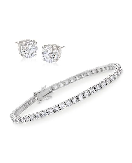 A trusted jeweler in 1952, Ross-Simons is dedicated to quality and value. This 8.00 ct. t.w. CZ tennis bracelet is so spectacular, no one will know it's faux. And to make it even more sensational, it comes with a FREE pair of 1.50 ct. t.w. CZ stud earrings. Both pieces are set in sterling silver for ultimate brilliance. To view these items and their details separately - bracelet – 825710, stud earrings – 791987. CZ tennis bracelet and stud earrings. CZ weights are diamond equivalents. Each Ross-Simons item arrives in a fine jewelry presentation box. Shop Ross-Simons jewelry risk-free as all items include a 30-day, 100% money-back guarantee.Stone InformationGem Type 1 - Cubic-ZirconiaStone Cut 1 - Good-CutStone Color 1 - ClearStone Clarity 1 - ClearStone Shape 1 - Round-ShapeStone Creation Method 1 - SyntheticStone Treatment Method 1 - Not-TreatedStone Weight 1 - 8.00-9.00 CaratsNumber Of Stones 1 - 0Gem Type 2 - Cubic-ZirconiaStone Cut 2 - Good-CutStone Color 2 - ClearStone Clarity 2 - ClearStone Shape 2 - Round-ShapeStone Creation Method 2 - SyntheticStone Treatment Method 2 - Not-TreatedStone Weight 2 - 0 CaratsNumber Of Stones 2 - 0