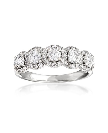 At Ross-Simons, we recognize the style power of versatile classics. Perfect as an anniversary band or gift for a very special occasion, this ring says "I love you" with 1.00 ct. t.w. of diamonds. Here, five round brilliant-cut diamonds are each haloed in diamond rounds. 14kt white gold band and setting. Halo diamond ring. Each Ross-Simons item arrives in a fine jewelry presentation box. Shop Ross-Simons jewelry risk-free as all items include a 30-day, 100% money-back guarantee.Stone InformationGem Type 1 - DiamondStone Cut 1 - Good-CutStone Color 1 - I-JStone Clarity 1 - I1Stone Shape 1 - Round-ShapeStone Creation Method 1 - NaturalStone Treatment Method 1 - Not-TreatedStone Weight 1 - 0.71 CaratsNumber Of Stones 1 - 5Gem Type 2 - DiamondStone Cut 2 - Good-CutStone Color 2 - I-JStone Clarity 2 - I1Stone Shape 2 - Round-ShapeStone Creation Method 2 - NaturalStone Treatment Method 2 - Not-TreatedStone Weight 2 - 0.20 CaratsNumber Of Stones 2 - 30Gem Type 3 - DiamondStone Cut 3 - Good-CutStone Color 3 - I-JStone Clarity 3 - I1Stone Shape 3 - Round-ShapeStone Creation Method 3 - NaturalStone Treatment Method 3 - Not-TreatedStone Weight 3 - 0.09 CaratsNumber Of Stones 3 - 18