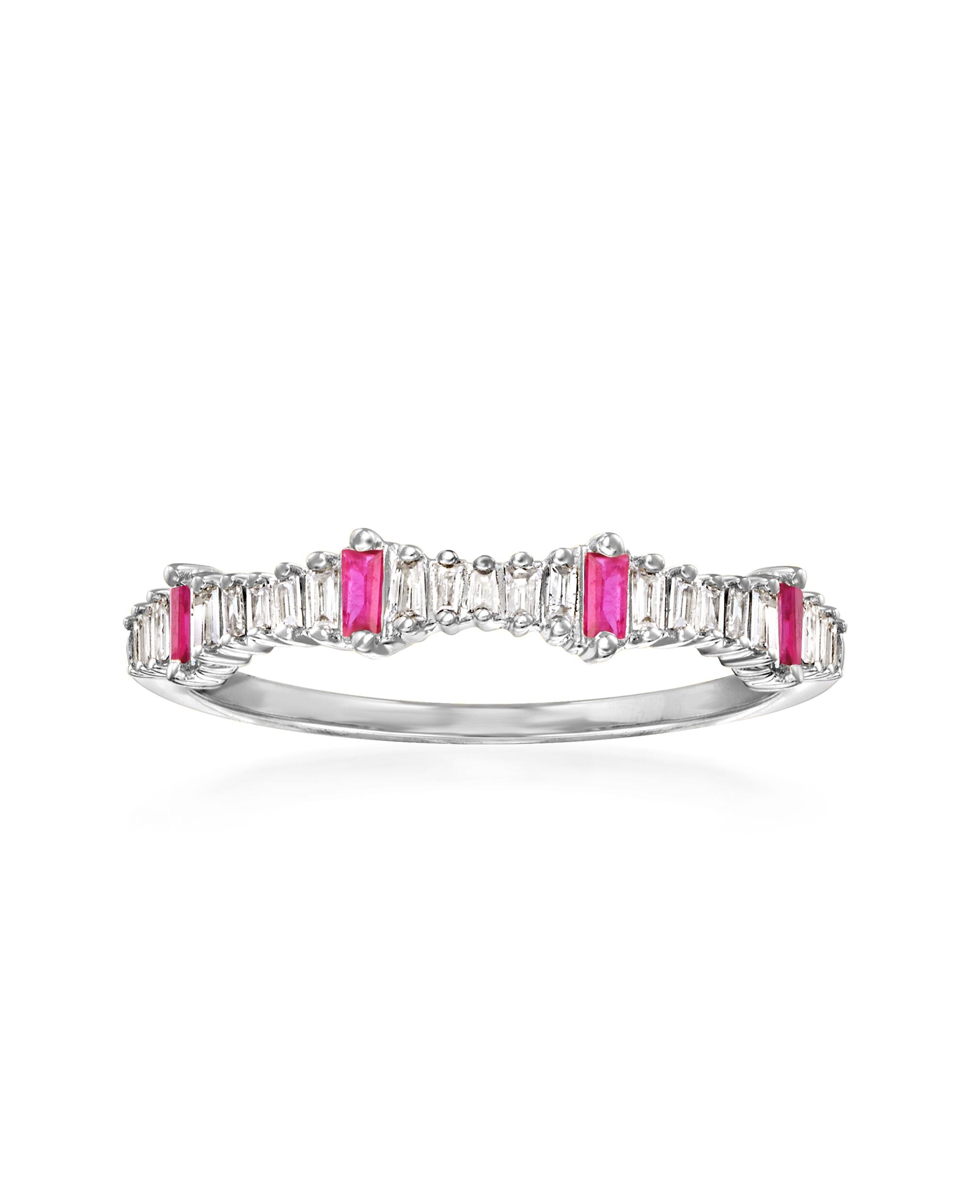 A top-rated jeweler since 1952, Ross-Simons travels the world to find high-quality styles at the best prices. So classic, so stackable! This band shines in an icy row of 0.14 ct. t.w. baguette diamonds and .10 ct. t.w. baguette rubies in polished 14kt white gold. 1/8" wide. Ruby and diamond ring. Each Ross-Simons item arrives in a fine jewelry presentation box. Shop Ross-Simons jewelry risk-free as all items include a 30-day, 100% money-back guarantee.Stone InformationGem Type 1 - RubyStone Cut 1 - Good-CutStone Color 1 - RedStone Clarity 1 - RedStone Shape 1 - Baguette-ShapeStone Creation Method 1 - NaturalStone Treatment Method 1 - Heat-TreatedStone Weight 1 - 0.10 CaratsNumber Of Stones 1 - 4Gem Type 2 - DiamondStone Cut 2 - Good-CutStone Color 2 - H-IStone Clarity 2 - I1Stone Shape 2 - Baguette-ShapeStone Creation Method 2 - NaturalStone Treatment Method 2 - Not-TreatedStone Weight 2 - 0.14 CaratsNumber Of Stones 2 - 21