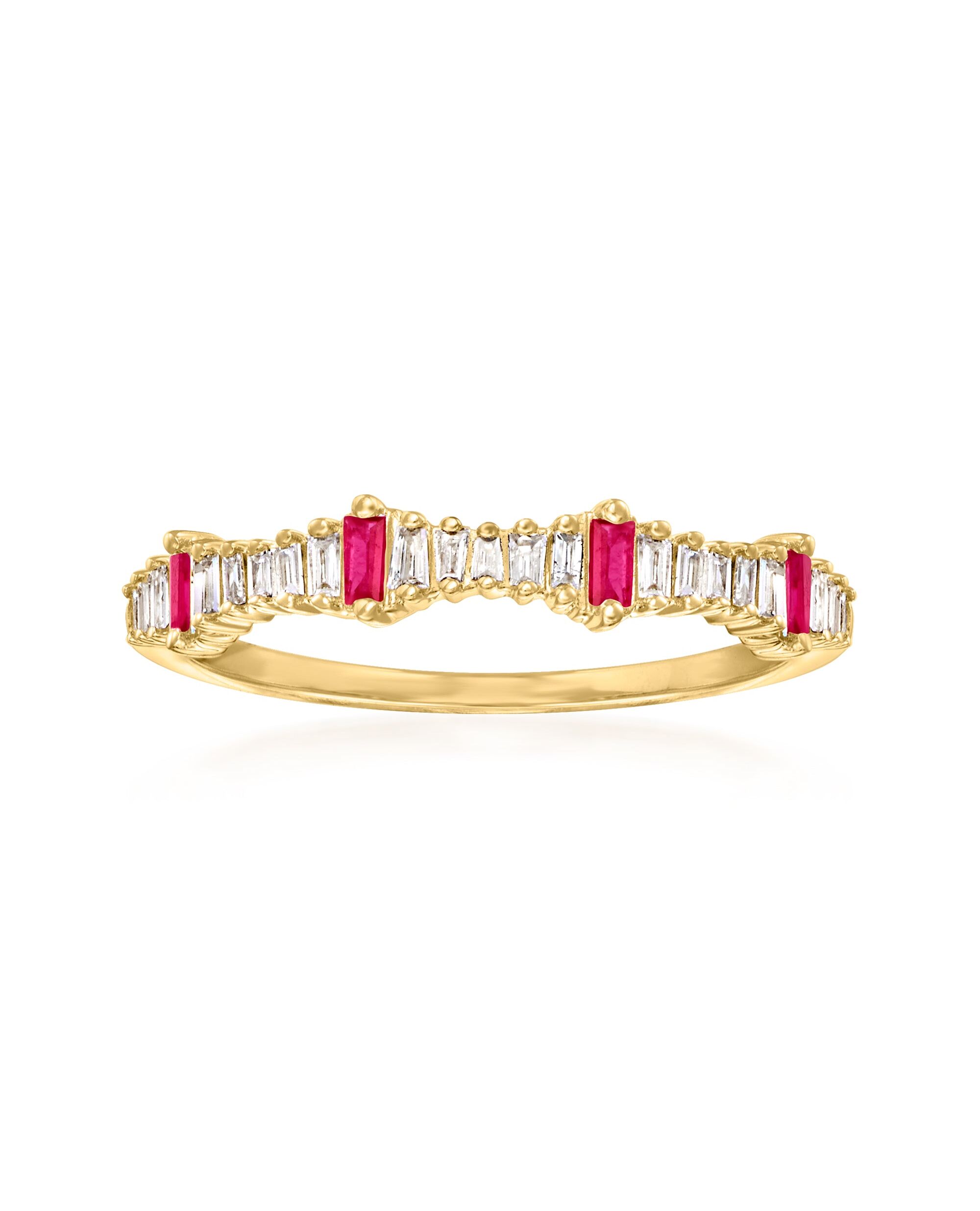 Ross-Simons presents contemporary styles with a timeless appeal. This colorful ring will be a staple to your stack. It features 0.14 ct. t.w. baguette diamonds with .10 ct. t.w. baguette rubies in polished 14kt yellow gold. 1/8" wide. Diamond and ruby stackable ring. Each Ross-Simons item arrives in a fine jewelry presentation box. Shop Ross-Simons jewelry risk-free as all items include a 30-day, 100% money-back guarantee.Stone InformationGem Type 1 - RubyStone Cut 1 - Good-CutStone Color 1 - RedStone Clarity 1 - RedStone Shape 1 - Rectangular-ShapeStone Creation Method 1 - NaturalStone Treatment Method 1 - Heat-TreatedStone Weight 1 - 0.10 CaratsNumber Of Stones 1 - 4Gem Type 2 - DiamondStone Cut 2 - Good-CutStone Color 2 - H-IStone Clarity 2 - I1Stone Shape 2 - Rectangular-ShapeStone Creation Method 2 - NaturalStone Treatment Method 2 - Not-TreatedStone Weight 2 - 0.14 CaratsNumber Of Stones 2 - 21