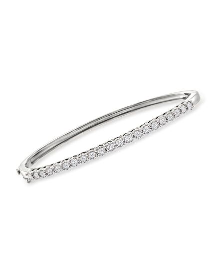 A top-rated jeweler since 1952, Ross-Simons travels the world to find high-quality styles at the best prices. The perfect bracelet to just slip on and go, this gorgeous 1.00 ct. t.w. round brilliant-cut diamond bangle adds some shimmer to any look. Set in polished sterling silver. Figure 8 safety. Push-button clasp, diamond bangle bracelet. Each Ross-Simons item arrives in a fine jewelry presentation box. Shop Ross-Simons jewelry risk-free as all items include a 30-day, 100% money-back guarantee.Stone InformationGem Type 1 - DiamondStone Cut 1 - Good-CutStone Color 1 - I-JStone Clarity 1 - I3Stone Shape 1 - Round-ShapeStone Creation Method 1 - NaturalStone Treatment Method 1 - Not-TreatedStone Weight 1 - 1.00 CaratsNumber Of Stones 1 - 21