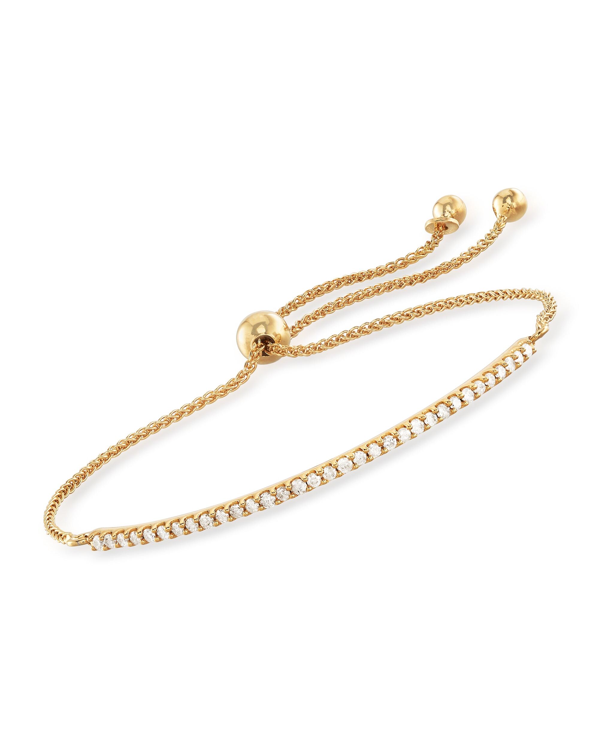 Developing fresh ways to wear timeless looks, Ross-Simons masters the classics. Add some sparkle to your look with our stylish bolo. The bracelet hosts a .50 ct. t.w. round brilliant-cut diamond curved bar on a polished 18kt yellow gold over sterling silver wheat chain. Adjusts to fit most wrists. Diamond bar bolo bracelet. Each Ross-Simons item arrives in a fine jewelry presentation box. Shop Ross-Simons jewelry risk-free as all items include a 30-day, 100% money-back guarantee.Stone InformationGem Type 1 - DiamondStone Cut 1 - Good-CutStone Color 1 - I-JStone Clarity 1 - I3Stone Shape 1 - Round-ShapeStone Creation Method 1 - NaturalStone Treatment Method 1 - Not-TreatedStone Weight 1 - 0.50 CaratsNumber Of Stones 1 - 33