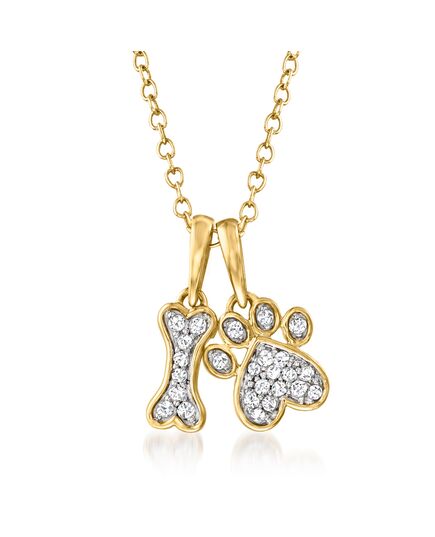 Developing fresh ways to wear timeless looks, Ross-Simons masters the classics. You're a dog lover with fabulous fashion sense, so this bone and paw necklace is right up your alley! Spot's giving you his paw and favorite treat all dressed up -- just for you -- in 0.10 ct. t.w. diamonds. Set in 14kt yellow gold on a cable chain with 2" extender. Springring clasp, diamond pendant necklace. Necklace drop length - 5/8 inch long. Necklace drop width - 3/8 inch wide. Each Ross-Simons item arrives in a fine jewelry presentation box. Shop Ross-Simons jewelry risk-free as all items include a 30-day, 100% money-back guarantee.Stone InformationGem Type 1 - DiamondStone Cut 1 - Good-CutStone Color 1 - I-JStone Clarity 1 - I2Stone Shape 1 - Round-ShapeStone Creation Method 1 - NaturalStone Treatment Method 1 - Not-TreatedStone Weight 1 - 0.06 CaratsNumber Of Stones 1 - 11Gem Type 2 - DiamondStone Cut 2 - Good-CutStone Color 2 - I-JStone Clarity 2 - I2Stone Shape 2 - Round-ShapeStone Creation Method 2 - NaturalStone Treatment Method 2 - Not-TreatedStone Weight 2 - 0.04 CaratsNumber Of Stones 2 - 8