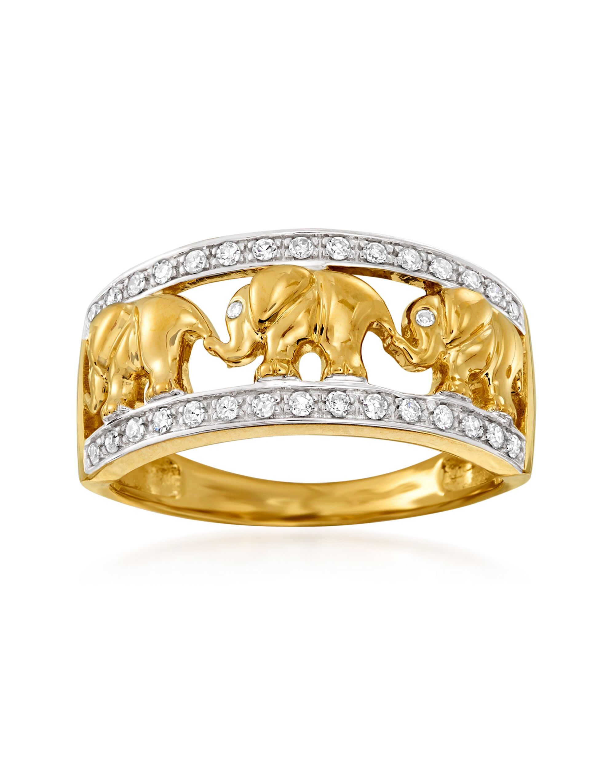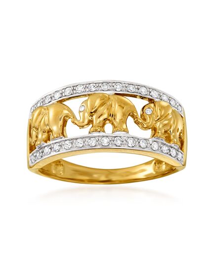 Developing fresh ways to wear timeless looks, Ross-Simons masters the classics. This openwork ring parades an exotic elephant motif with 0.20 ct. t.w. diamonds across the front. Crafted in 14kt yellow gold. 3/8" wide Diamond ring. Each Ross-Simons item arrives in a fine jewelry presentation box. Shop Ross-Simons jewelry risk-free as all items include a 30-day, 100% money-back guarantee.Stone InformationGem Type 1 - DiamondStone Cut 1 - Good-CutStone Color 1 - HStone Clarity 1 - I1Stone Shape 1 - Round-ShapeStone Creation Method 1 - NaturalStone Treatment Method 1 - Not-TreatedStone Weight 1 - 0.20 CaratsNumber Of Stones 1 - 33
