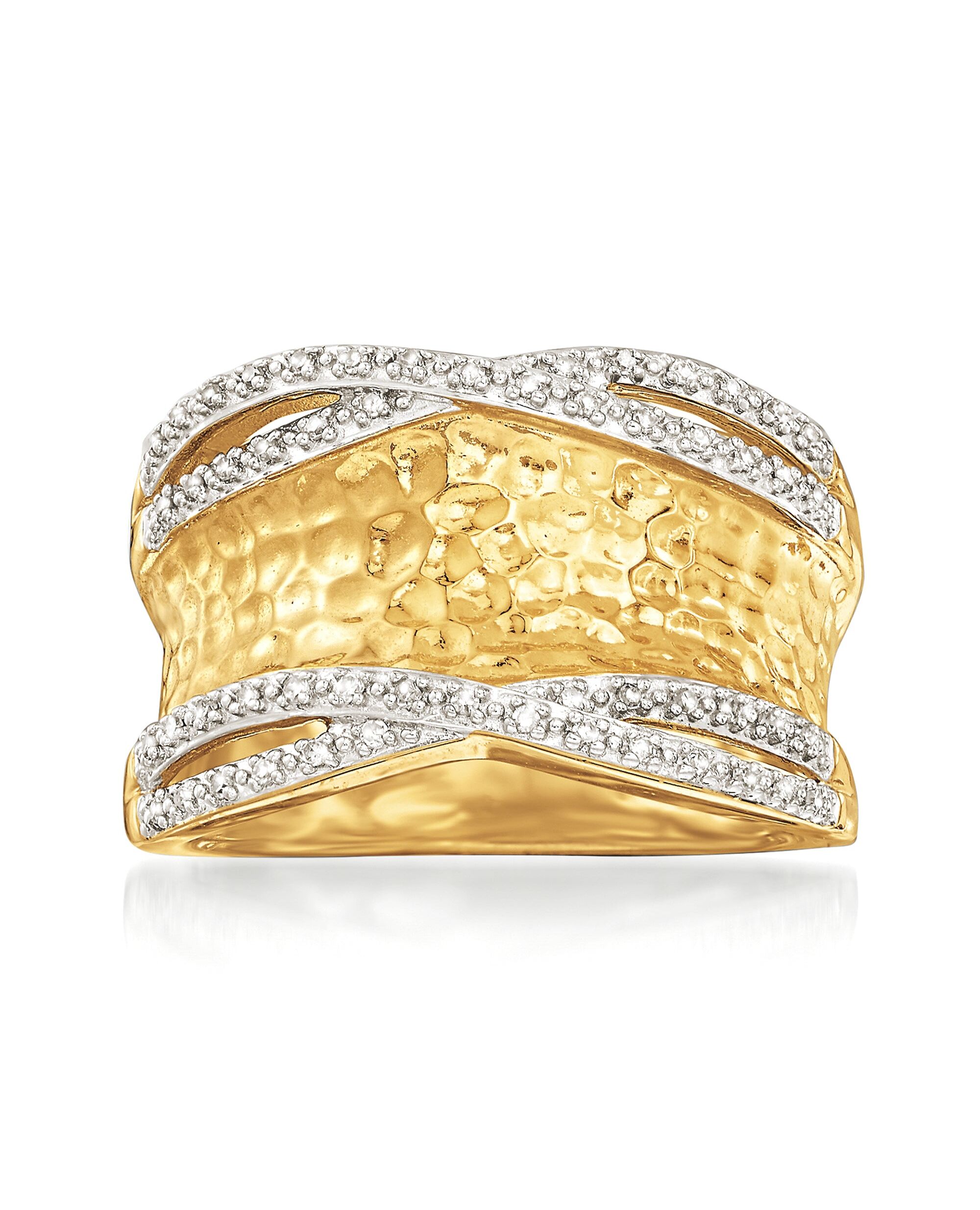 At Ross-Simons, we recognize the style power of versatile classics. An RS exclusive. This luminous ring features crossing rows of 0.13 ct. t.w. diamonds along the edge of a polished and hammered 18kt gold over sterling silver band. 1/2" wide. 18kt yellow gold over sterling silver diamond ring. Each Ross-Simons item arrives in a fine jewelry presentation box. Shop Ross-Simons jewelry risk-free as all items include a 30-day, 100% money-back guarantee.Stone InformationGem Type 1 - DiamondStone Cut 1 - Good-CutStone Color 1 - H-IStone Clarity 1 - I2Stone Shape 1 - Round-ShapeStone Creation Method 1 - NaturalStone Treatment Method 1 - Not-TreatedStone Weight 1 - 0.13 CaratsNumber Of Stones 1 - 54