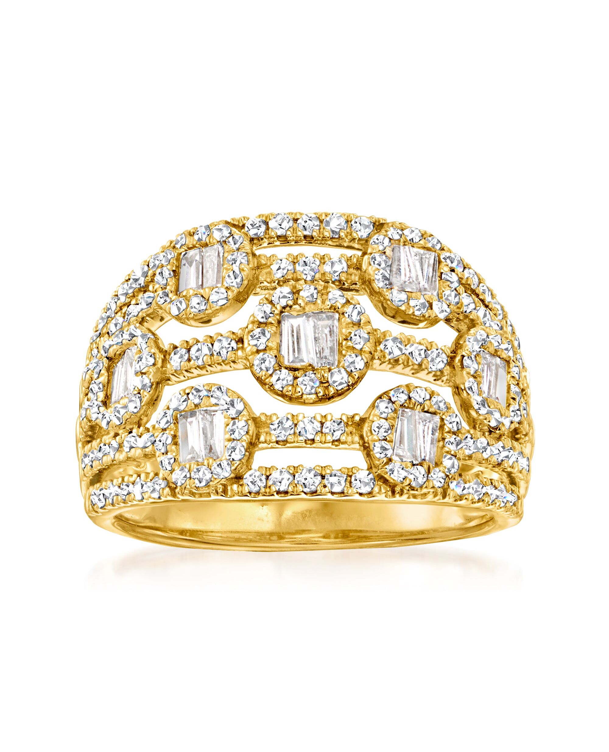 Ross-Simons presents contemporary styles with a timeless appeal. This beautiful ring showcases multiple rows of sparkling baguette and round diamonds, totaling 1.00 carat. An impressive design that shines in polished 14kt yellow gold. You'll love showing off this fine piece of luxury. 1/2" wide. Diamond ring. Each Ross-Simons item arrives in a fine jewelry presentation box. Shop Ross-Simons jewelry risk-free as all items include a 30-day, 100% money-back guarantee.Stone InformationGem Type 1 - DiamondStone Cut 1 - Good-CutStone Color 1 - I-JStone Clarity 1 - I1Stone Shape 1 - Round-ShapeStone Creation Method 1 - NaturalStone Treatment Method 1 - Not-TreatedStone Weight 1 - 0.71 CaratsNumber Of Stones 1 - 158Gem Type 2 - DiamondStone Cut 2 - Good-CutStone Color 2 - I-JStone Clarity 2 - I1Stone Shape 2 - Round-ShapeStone Creation Method 2 - NaturalStone Treatment Method 2 - Not-TreatedStone Weight 2 - 0.28 CaratsNumber Of Stones 2 - 14