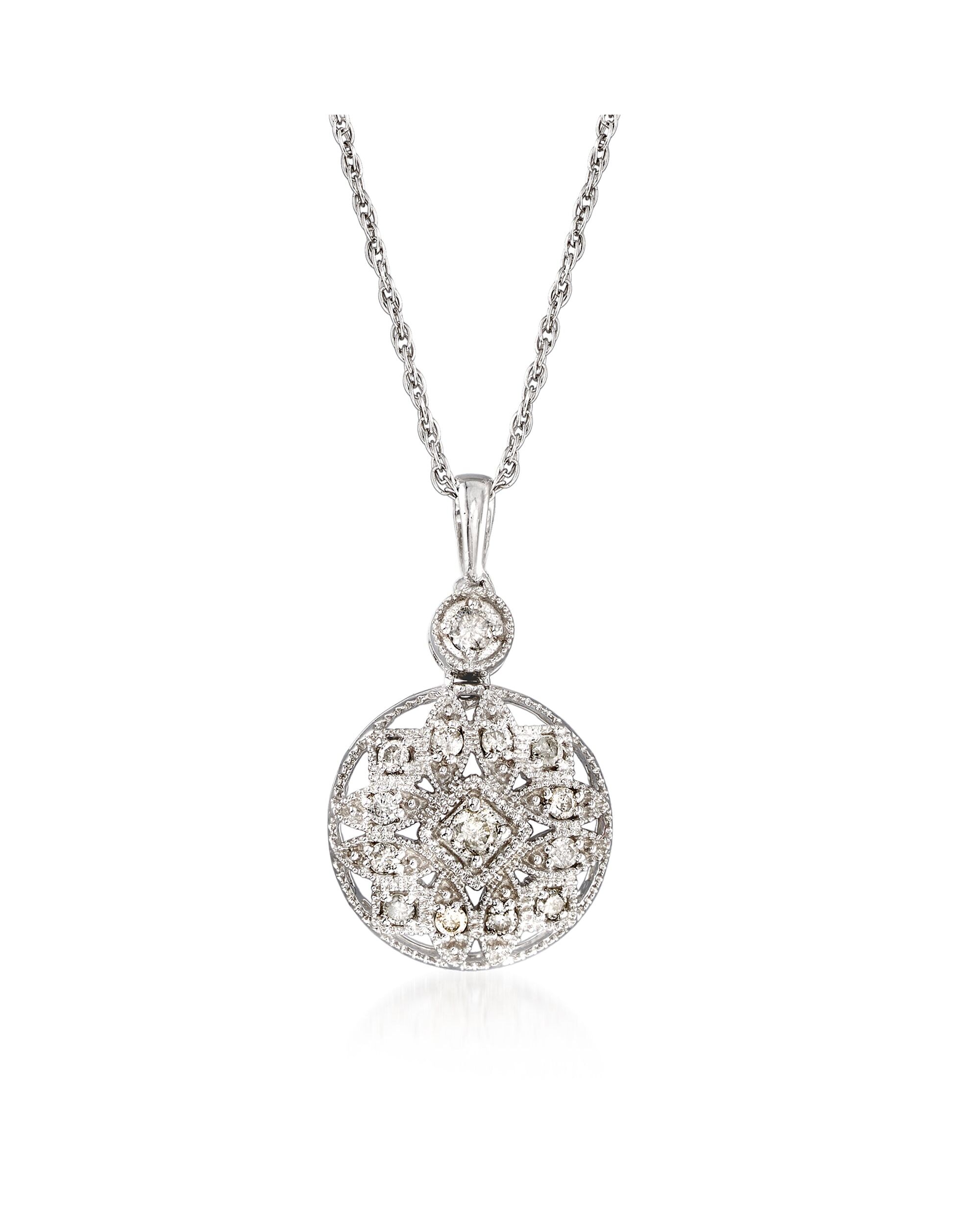 Ross-Simons is always looking for new ways to reinvent essential jewelry styles. Our pendant necklace is a glittery beauty. The sterling silver design boasts an openwork circle pendant that sparkles with 0.25 ct. t.w. round brilliant-cut diamonds. Polished finish. Suspends from a rope chain. Springring clasp, diamond openwork pendant necklace. Necklace drop length - 7/8 inch long. Necklace drop width - 1/2 inch wide. Each Ross-Simons item arrives in a fine jewelry presentation box. Shop Ross-Simons jewelry risk-free as all items include a 30-day, 100% money-back guarantee.Stone InformationGem Type 1 - DiamondStone Cut 1 - Good-CutStone Color 1 - I-JStone Clarity 1 - I2Stone Shape 1 - Round-ShapeStone Creation Method 1 - NaturalStone Treatment Method 1 - Not-TreatedStone Weight 1 - 0.25 CaratsNumber Of Stones 1 - 14