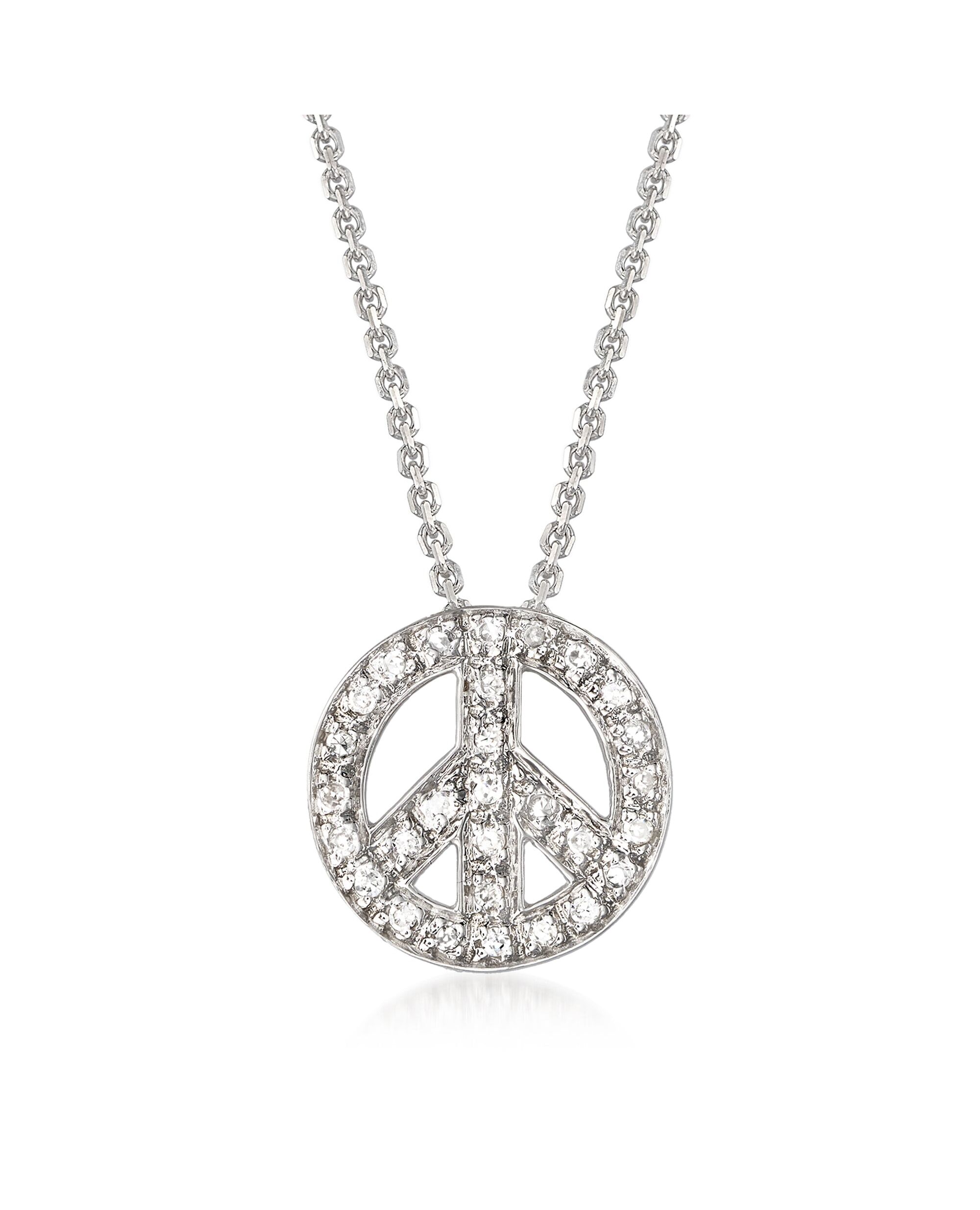 Developing fresh ways to wear timeless looks, Ross-Simons masters the classics. The widely-recognized peace sign lights up with 0.10 ct. t.w. diamond sparks. Suspends from a 14kt white gold cable chain with a springring clasp. Diamond peace sign pendant necklace. Necklace drop length - 3/8 inch long. Necklace drop width - 3/8 inch wide. Each Ross-Simons item arrives in a fine jewelry presentation box. Shop Ross-Simons jewelry risk-free as all items include a 30-day, 100% money-back guarantee.Stone InformationGem Type 1 - DiamondStone Cut 1 - Good-CutStone Color 1 - H-IStone Clarity 1 - SI2Stone Shape 1 - Round-ShapeStone Creation Method 1 - NaturalStone Treatment Method 1 - Not-TreatedStone Weight 1 - 0.10 CaratsNumber Of Stones 1 - 29