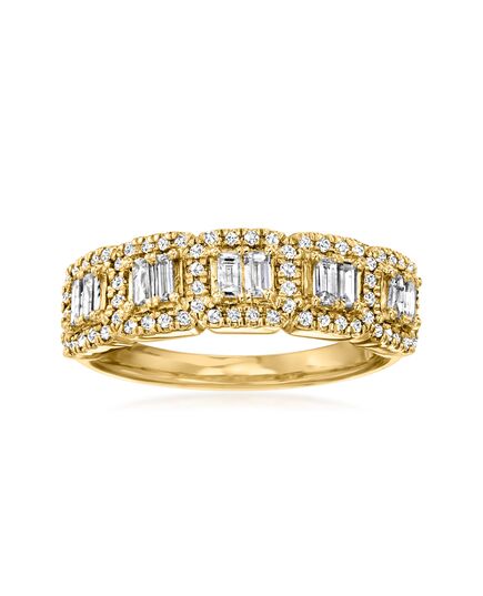 A top-rated jeweler since 1952, Ross-Simons travels the world to find high-quality styles at the best prices. Whether you're looking for a special anniversary band or fabulous diamond sparkle for your stack, this ring delivers major dazzle for any occasion! 0.50 ct. t.w. baguette and round diamonds shimmer in stylized stations set in polished 14kt yellow gold. 1/4" wide. Diamond ring. Each Ross-Simons item arrives in a fine jewelry presentation box. Shop Ross-Simons jewelry risk-free as all items include a 30-day, 100% money-back guarantee.Stone InformationGem Type 1 - DiamondStone Cut 1 - Good-CutStone Color 1 - I-JStone Clarity 1 - I2Stone Shape 1 - Baguette-ShapeStone Creation Method 1 - NaturalStone Treatment Method 1 - Not-TreatedStone Weight 1 - 0.28 CaratsNumber Of Stones 1 - 10Gem Type 2 - DiamondStone Cut 2 - Good-CutStone Color 2 - I-JStone Clarity 2 - I2Stone Shape 2 - Round-ShapeStone Creation Method 2 - NaturalStone Treatment Method 2 - Not-TreatedStone Weight 2 - 0.21 CaratsNumber Of Stones 2 - 66