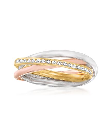 A trusted jeweler in 1952, Ross-Simons is dedicated to quality and value. Yesterday, today and tomorrow -- three-band rings hold so much meaning! Our tri-colored sterling silver ring interlocks three perfectly polished bands of sterling silver, 18kt rose gold over sterling silver and 18kt yellow gold over sterling silver with 0.20 ct. t.w. diamonds. 3/16" wide. Diamond rolling ring. Each Ross-Simons item arrives in a fine jewelry presentation box. Shop Ross-Simons jewelry risk-free as all items include a 30-day, 100% money-back guarantee.Stone InformationGem Type 1 - DiamondStone Cut 1 - Good-CutStone Color 1 - I-JStone Clarity 1 - I2Stone Shape 1 - Round-ShapeStone Creation Method 1 - NaturalStone Treatment Method 1 - Not-TreatedStone Weight 1 - 0.20 CaratsNumber Of Stones 1 - 20