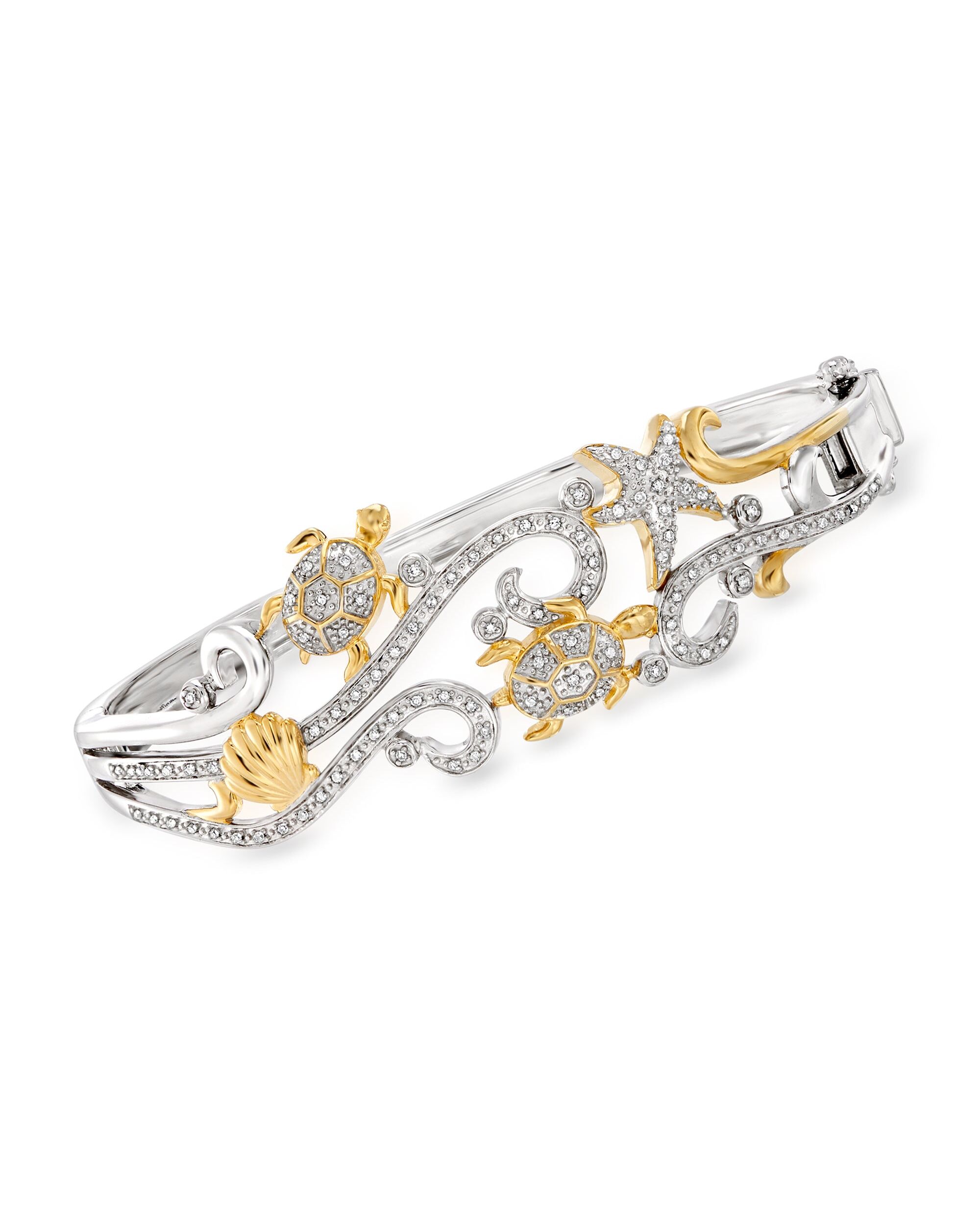 Established in 1952, Ross-Simons presents contemporary styles with a timeless appeal. A whole scene of sea creatures makes a splash in our two-tone bracelet. Our whimsical bangle features a seashell, starfish and a couple of sea turtles swim in a sparkling sea of .25 ct. t.w. diamonds. With hints of 18kt yellow gold over sterling silver, every detail is pristinely accentuated. Double-latch safety. Box clasp, two-tone diamond sea life bangle bracelet. Each Ross-Simons item arrives in a fine jewelry presentation box. Shop Ross-Simons jewelry risk-free as all items include a 30-day, 100% money-back guarantee.Stone InformationGem Type 1 - DiamondStone Cut 1 - Good-CutStone Color 1 - H-IStone Clarity 1 - I1Stone Shape 1 - Round-ShapeStone Creation Method 1 - NaturalStone Treatment Method 1 - Not-TreatedStone Weight 1 - 0.25 CaratsNumber Of Stones 1 - 92