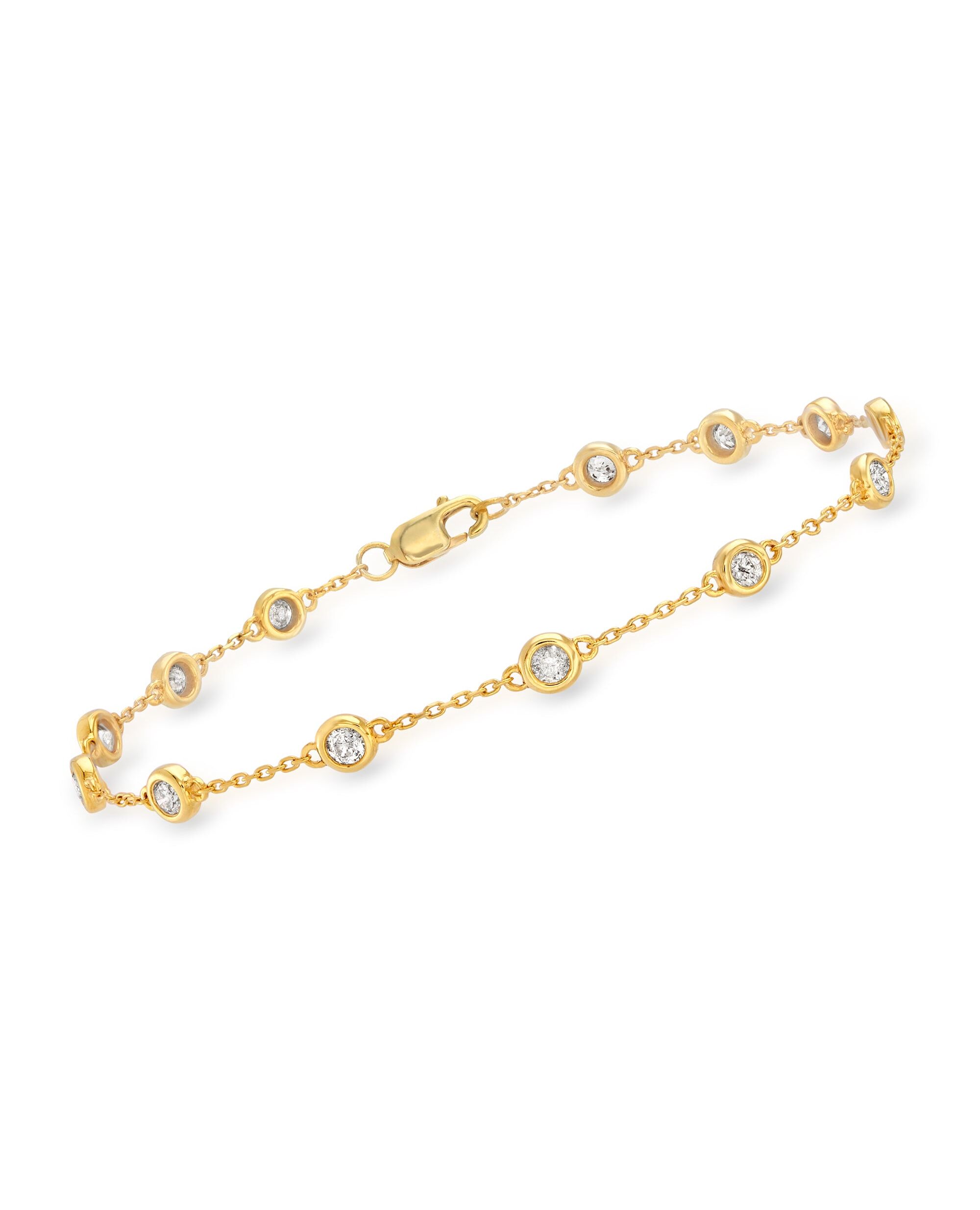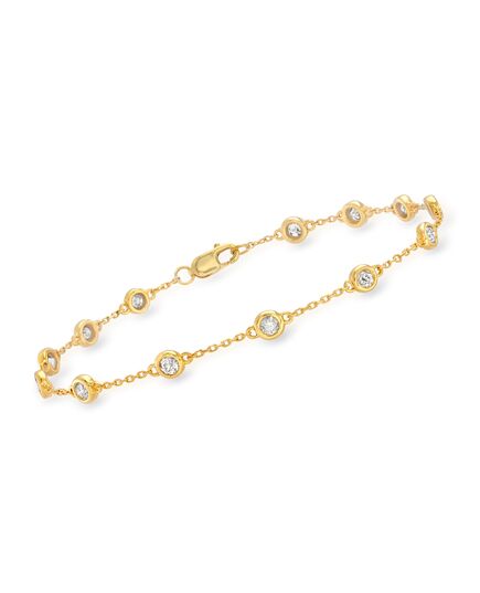 With a commitment to quality and affordability, Ross-Simons presents timeless jewelry for the modern woman. This 1.00 ct. t.w. diamond station bracelet knows no style expiration date. The time-honored design bezel-sets 13 round brilliant-cut diamonds on a 18kt yellow gold over sterling silver cable chain. Lobster clasp, diamond station bracelet. Each Ross-Simons item arrives in a fine jewelry presentation box. Shop Ross-Simons jewelry risk-free as all items include a 30-day, 100% money-back guarantee.Stone InformationGem Type 1 - DiamondStone Cut 1 - Good-CutStone Color 1 - I-JStone Clarity 1 - I3Stone Shape 1 - Round-ShapeStone Creation Method 1 - NaturalStone Treatment Method 1 - Not-TreatedStone Weight 1 - 0.51 CaratsNumber Of Stones 1 - 7Gem Type 2 - DiamondStone Cut 2 - Good-CutStone Color 2 - I-JStone Clarity 2 - I3Stone Shape 2 - Round-ShapeStone Creation Method 2 - NaturalStone Treatment Method 2 - Not-TreatedStone Weight 2 - 0.49 CaratsNumber Of Stones 2 - 6