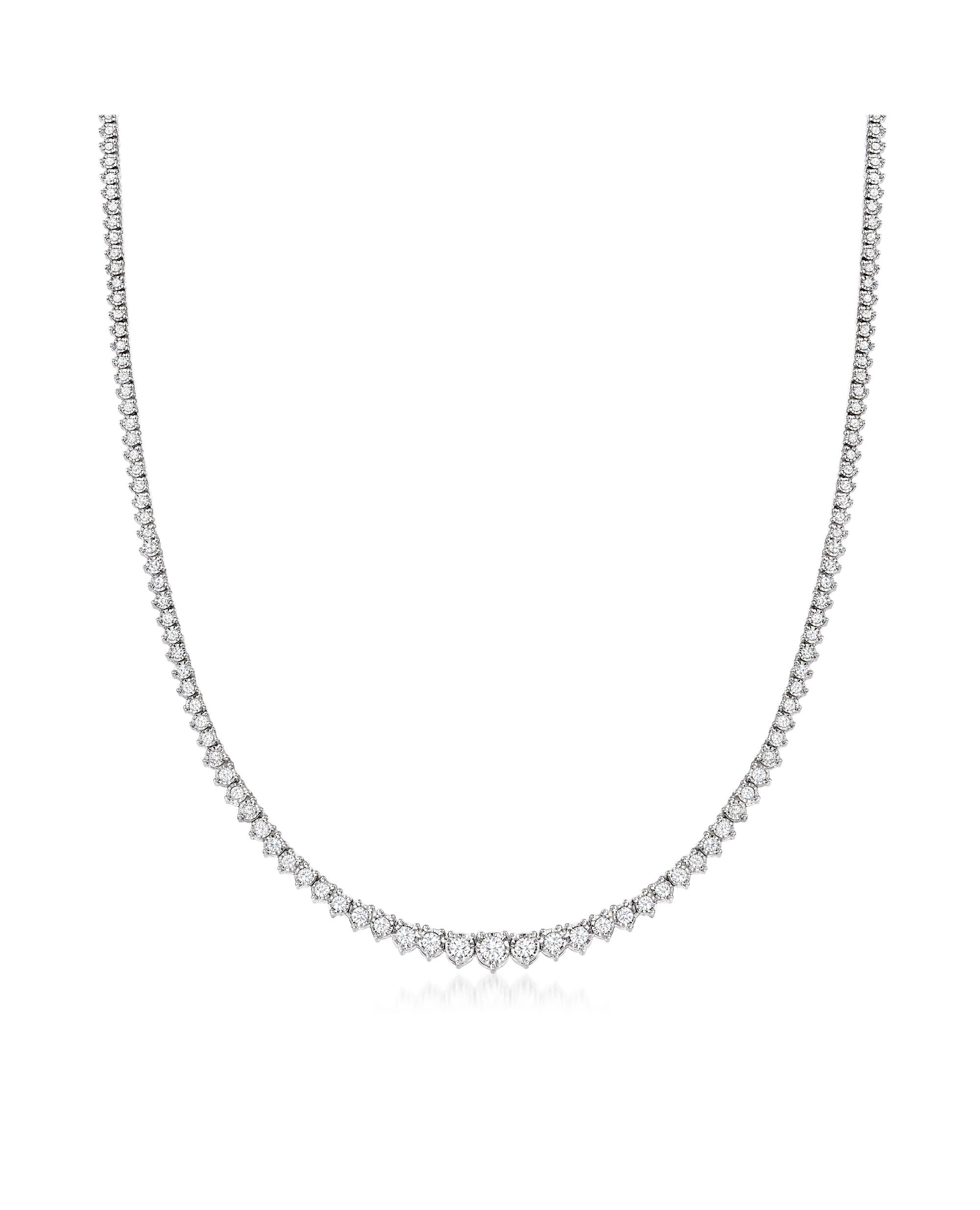 A trusted jeweler in 1952, Ross-Simons is dedicated to quality and value. Graduating from 1/8" to 1/4" wide, this 3.00 ct. t.w. round brilliant-cut diamond tennis necklace is a staple for the avid diamond lover. Dress it up or dress it down, this piece looks great on-duty or off. Shines in sterling silver. Single-latch safety. Push-button clasp, diamond tennis necklace. Each Ross-Simons item arrives in a fine jewelry presentation box. Shop Ross-Simons jewelry risk-free as all items include a 30-day, 100% money-back guarantee.Stone InformationGem Type 1 - DiamondStone Cut 1 - Good-CutStone Color 1 - I-JStone Clarity 1 - I3Stone Shape 1 - Round-ShapeStone Creation Method 1 - NaturalStone Treatment Method 1 - Not-TreatedStone Weight 1 - 3.00 CaratsNumber Of Stones 1 - 152