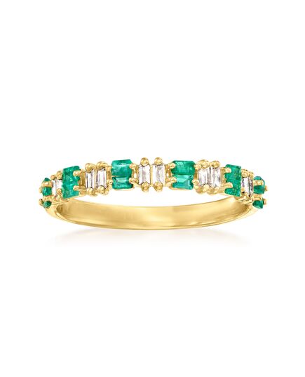 Established in 1952, Ross-Simons presents contemporary styles with a timeless appeal. RS Pure. Modern designs that complete your outfit and complement your personality. Treat yourself to this sparkling ring. Alternating sections of 0.20 ct. t.w. emerald baguettes and .10 ct. t.w. diamond baguettes shine in 14kt yellow gold. At 1/8" wide, it's great as a minimalist solo statement or perfect for stacking. Diamond and enerald ring. Each Ross-Simons item arrives in a fine jewelry presentation box. Shop Ross-Simons jewelry risk-free as all items include a 30-day, 100% money-back guarantee.Stone InformationGem Type 1 - EmeraldStone Cut 1 - Good-CutStone Color 1 - GreenStone Clarity 1 - GreenStone Shape 1 - Baguette-ShapeStone Creation Method 1 - NaturalStone Treatment Method 1 - OiledStone Weight 1 - 0.20 CaratsNumber Of Stones 1 - 12Gem Type 2 - DiamondStone Cut 2 - Good-CutStone Color 2 - H-IStone Clarity 2 - I1Stone Shape 2 - Rectangular-ShapeStone Creation Method 2 - NaturalStone Treatment Method 2 - Not-TreatedStone Weight 2 - 0.10 CaratsNumber Of Stones 2 - 10