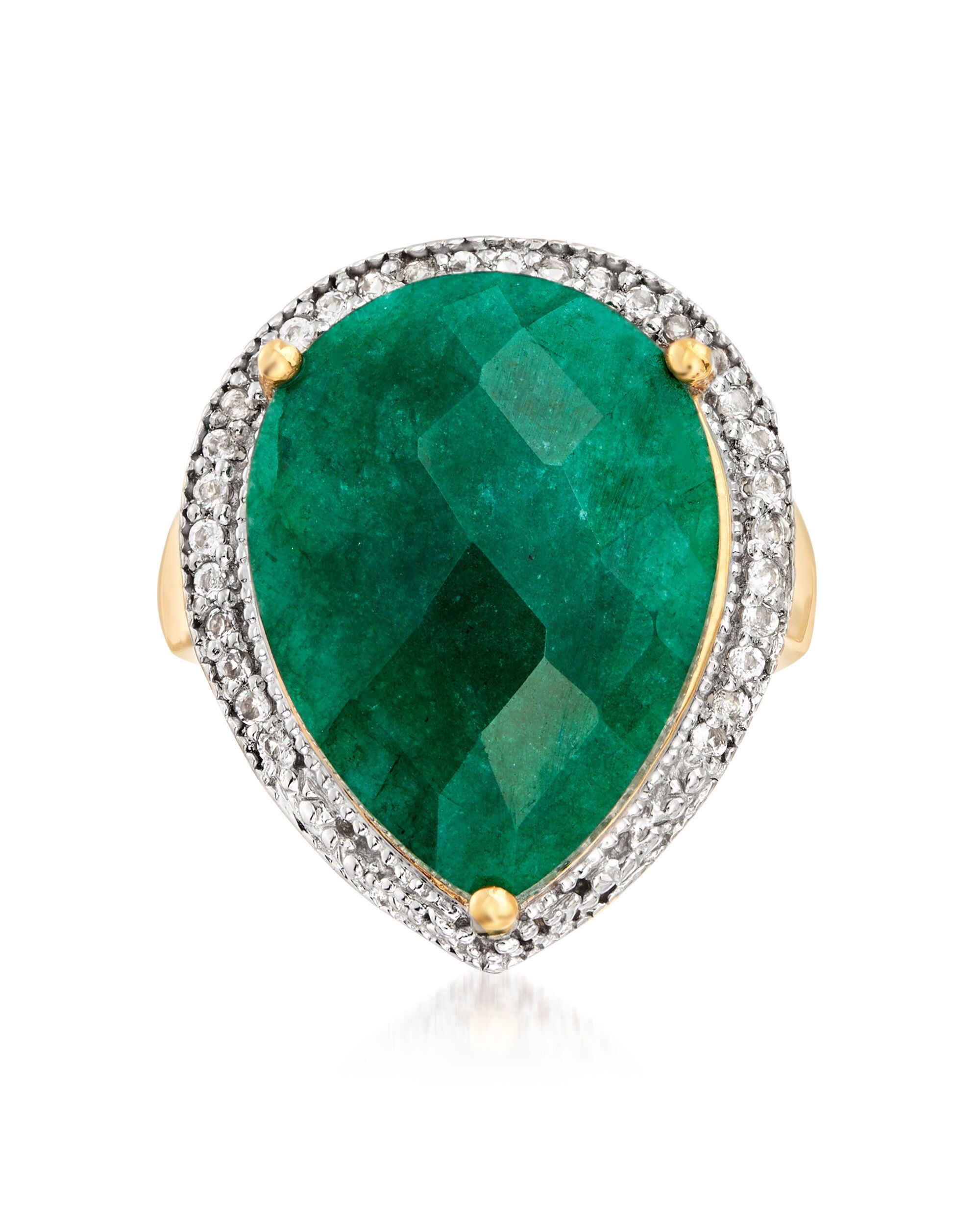 Ross-Simons is the authority on luxury classics. This elegant ring boasts an 11.00 carat pear-shaped emerald framed by .40 ct. t.w. white topaz rounds in polished 18kt yellow gold over sterling silver with white rhodium. 15/16" wide. White topaz and emerald ring. Each Ross-Simons item arrives in a fine jewelry presentation box. Shop Ross-Simons jewelry risk-free as all items include a 30-day, 100% money-back guarantee.Stone InformationGem Type 1 - EmeraldStone Cut 1 - CheckerboardStone Color 1 - GreenStone Clarity 1 - GreenStone Shape 1 - Pear-ShapeStone Creation Method 1 - NaturalStone Treatment Method 1 - OiledStone Weight 1 - 11.00 CaratsNumber Of Stones 1 - 1Gem Type 2 - TopazStone Cut 2 - Good-CutStone Color 2 - WhiteStone Clarity 2 - WhiteStone Shape 2 - Round-ShapeStone Creation Method 2 - NaturalStone Treatment Method 2 - Heat-Treated,IrradiatedStone Weight 2 - 0.40 CaratsNumber Of Stones 2 - 30