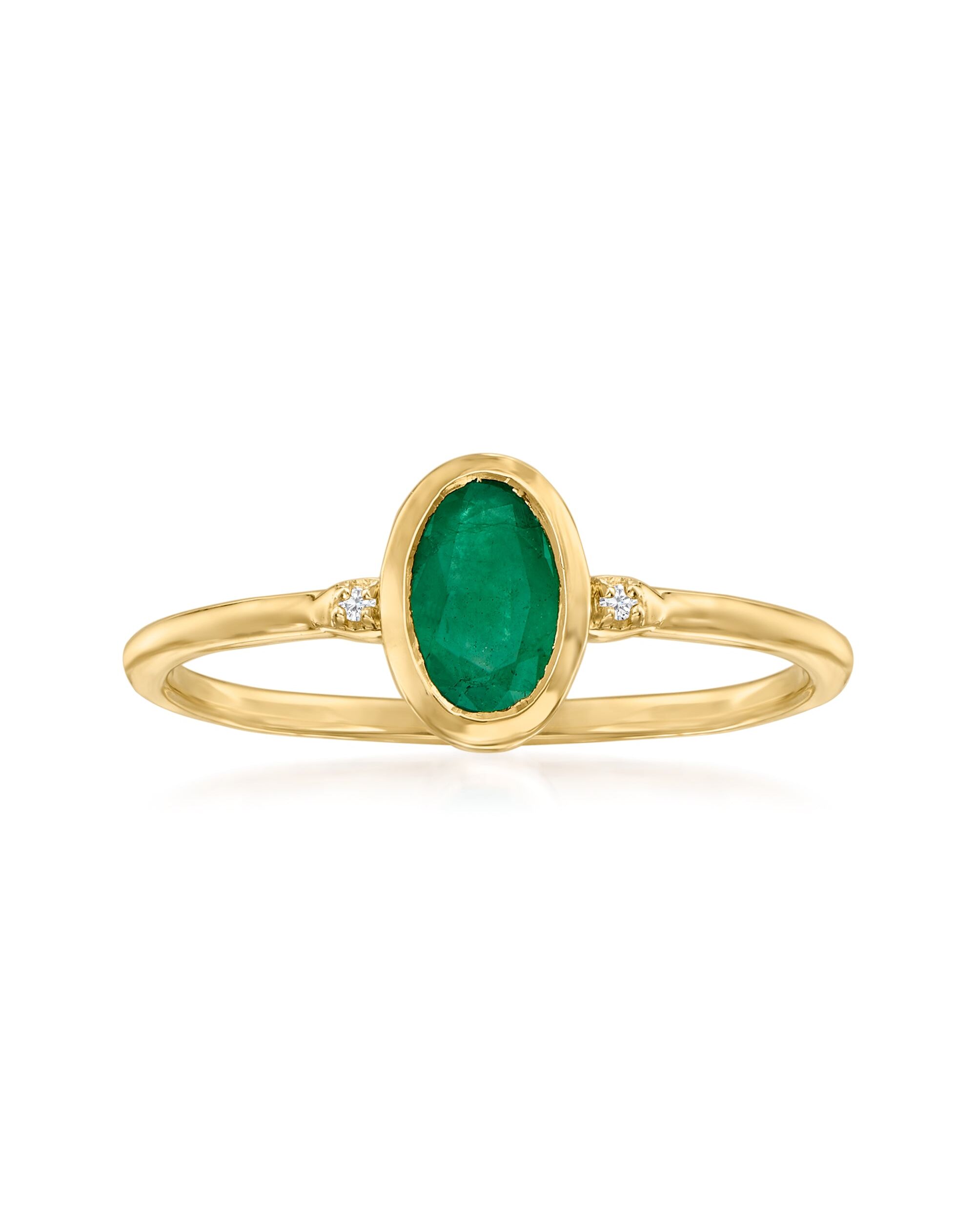 Developing fresh ways to wear timeless looks, Ross-Simons masters the classics. If simplicity is your style, then you've just met your newest ring. A bezel-set .50 carat emerald oval sits at the center of the design, sparked by two round brilliant-cut diamond accents. Set in polished 14kt yellow gold. 1/4" wide. Emerald ring. Each Ross-Simons item arrives in a fine jewelry presentation box. Shop Ross-Simons jewelry risk-free as all items include a 30-day, 100% money-back guarantee.Stone InformationGem Type 1 - EmeraldStone Cut 1 - Good-CutStone Color 1 - GreenStone Clarity 1 - GreenStone Shape 1 - Oval-ShapeStone Creation Method 1 - NaturalStone Treatment Method 1 - OiledStone Weight 1 - 0.50 CaratsNumber Of Stones 1 - 1Gem Type 2 - DiamondStone Cut 2 - Good-CutStone Color 2 - H-IStone Clarity 2 - I1Stone Shape 2 - Round-ShapeStone Creation Method 2 - NaturalStone Treatment Method 2 - Not-TreatedStone Weight 2 - 0.01 CaratsNumber Of Stones 2 - 2