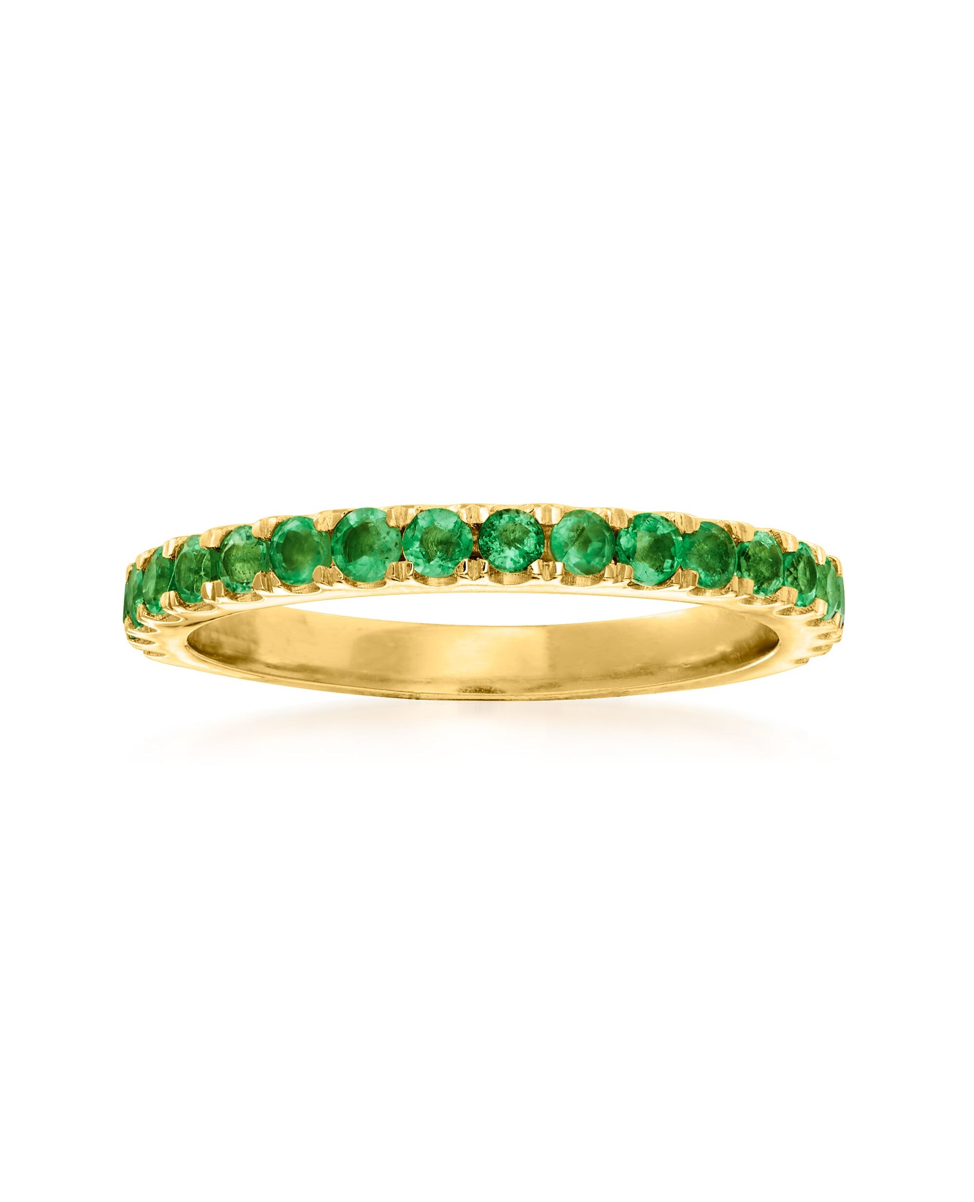 Ross-Simons is the authority on luxury classics. This ring is the perfect gift for a May birthday (or any birthday!). Lovely 0.50 ct. t.w. Zambian emerald rounds sparkle in polished 18kt yellow gold over sterling silver. 1/8" wide. Emerald ring. Each Ross-Simons item arrives in a fine jewelry presentation box. Shop Ross-Simons jewelry risk-free as all items include a 30-day, 100% money-back guarantee.Stone InformationGem Type 1 - EmeraldStone Cut 1 - Good-CutStone Color 1 - GreenStone Clarity 1 - GreenStone Shape 1 - Round-ShapeStone Creation Method 1 - NaturalStone Treatment Method 1 - OiledStone Weight 1 - 0.50 CaratsNumber Of Stones 1 - 19