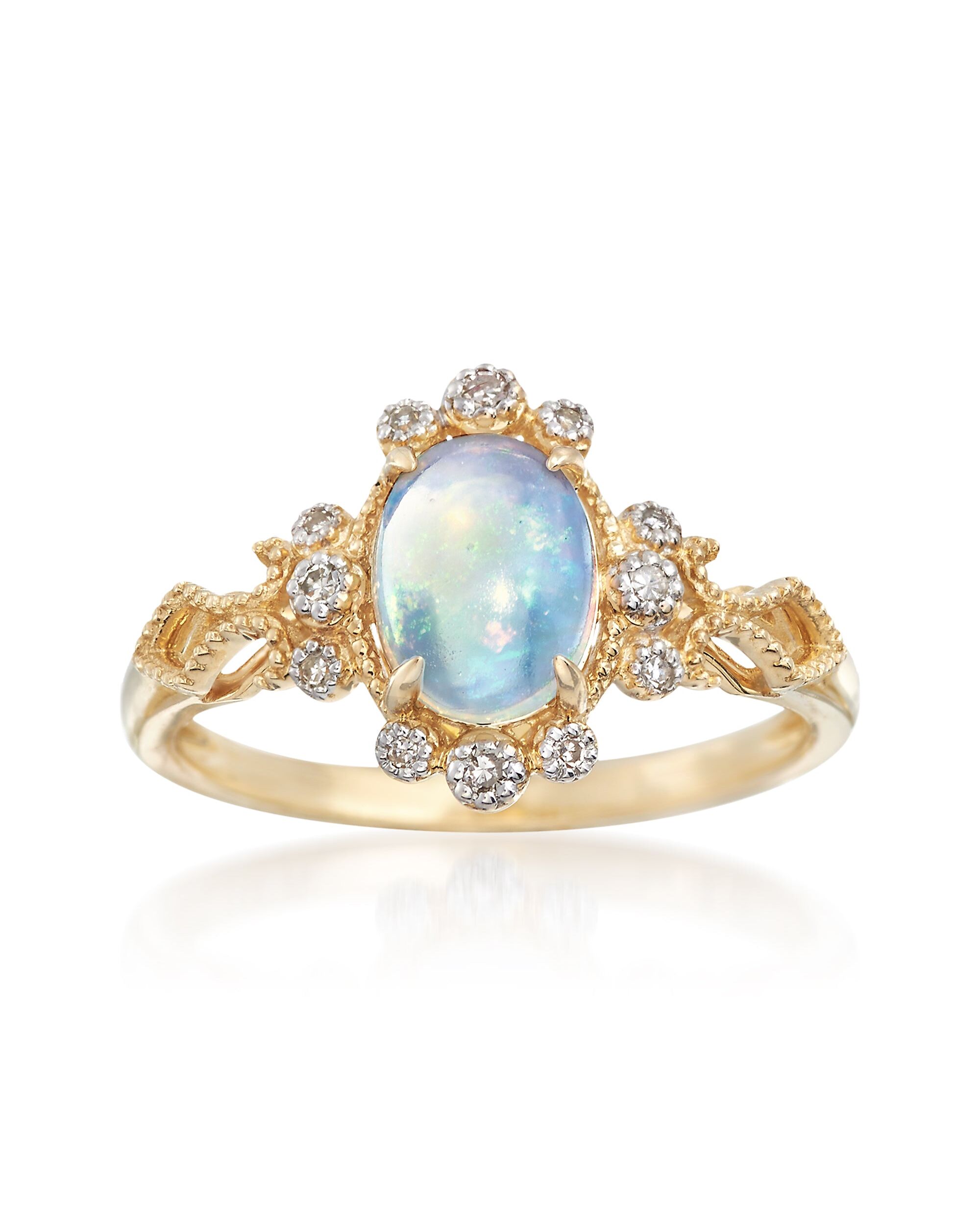 With a commitment to quality and affordability, Ross-Simons presents timeless jewelry for the modern woman. Our fanciful 8x6mm oval Ethiopian opal cabochon ring shows off a whimsical prism of color, further enhanced by sparkling diamond accents. Set in polished 14kt yellow gold, it presents a truly magical combination that will add an undeniably elegant aura to nearly any look, casual or formal. 1/2" wide. Diamond and opal ring. Each Ross-Simons item arrives in a fine jewelry presentation box. Shop Ross-Simons jewelry risk-free as all items include a 30-day, 100% money-back guarantee.Stone InformationGem Type 1 - OpalStone Cut 1 - CabochonStone Color 1 - WhiteStone Clarity 1 - WhiteStone Shape 1 - Oval-ShapeStone Creation Method 1 - NaturalStone Treatment Method 1 - ImpregnatedStone Weight 1 - 0 CaratsNumber Of Stones 1 - 1Gem Type 2 - DiamondStone Cut 2 - Good-CutStone Color 2 - Good-CutStone Clarity 2 - Good-CutStone Shape 2 - Special-Cut-ShapeStone Creation Method 2 - NaturalStone Treatment Method 2 - Not-TreatedStone Weight 2 - 0 CaratsNumber Of Stones 2 - 0