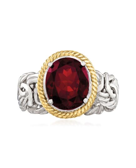 Ross-Simons travels the world to find beautiful, high-quality styles at the best prices. Bask in the warmth of fiery red garnets! This ring features a 3.40 carat oval garnet framed by 14kt yellow gold on a band of sterling silver rope-like designs. 1/2" wide. Garnet ring. Each Ross-Simons item arrives in a fine jewelry presentation box. Shop Ross-Simons jewelry risk-free as all items include a 30-day, 100% money-back guarantee.Stone InformationGem Type 1 - GarnetStone Cut 1 - Good-CutStone Color 1 - RedStone Clarity 1 - RedStone Shape 1 - Oval-ShapeStone Creation Method 1 - NaturalStone Treatment Method 1 - Not-TreatedStone Weight 1 - 3.40 CaratsNumber Of Stones 1 - 1
