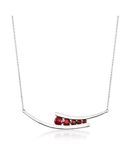 A trusted jeweler in 1952, Ross-Simons is dedicated to quality and value. This contemporary curved bar necklace flaunts a graduated array of 1.85 ct. t.w. round garnets. Crafted in polished sterling silver. Suspends from a cable chain. Lobster clasp, garnet curved necklace. Necklace drop length - 3/8 inch long. Necklace drop width - 2 1/4 inches wide. Each Ross-Simons item arrives in a fine jewelry presentation box. Shop Ross-Simons jewelry risk-free as all items include a 30-day, 100% money-back guarantee.Stone InformationGem Type 1 - GarnetStone Cut 1 - Good-CutStone Color 1 - RedStone Clarity 1 - RedStone Shape 1 - Round-ShapeStone Creation Method 1 - NaturalStone Treatment Method 1 - Not-TreatedStone Weight 1 - 1.60 CaratsNumber Of Stones 1 - 3Gem Type 2 - GarnetStone Cut 2 - Good-CutStone Color 2 - RedStone Clarity 2 - RedStone Shape 2 - Round-ShapeStone Creation Method 2 - NaturalStone Treatment Method 2 - Not-TreatedStone Weight 2 - 0.25 CaratsNumber Of Stones 2 - 2