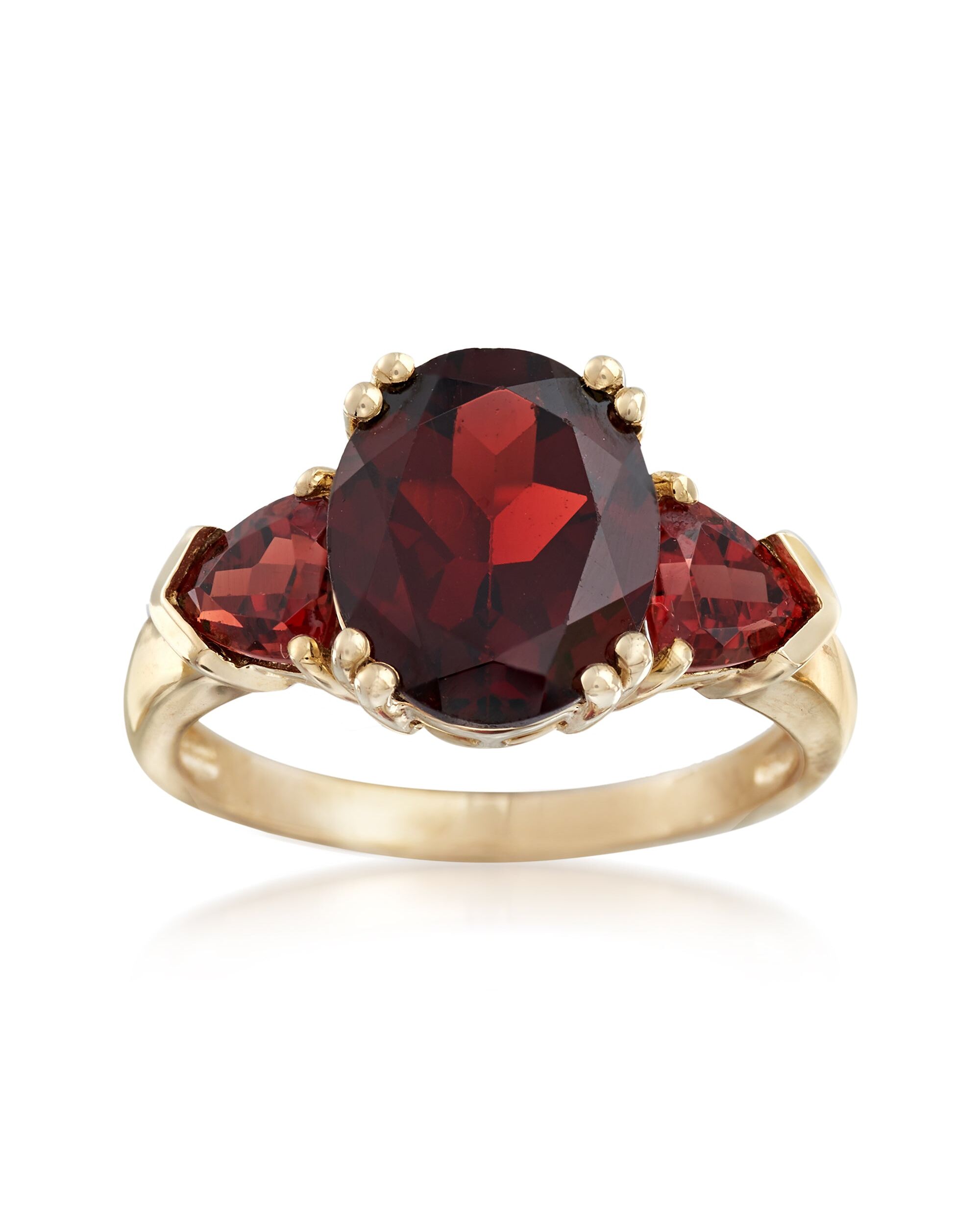 Ross-Simons is the authority on fashionable must-haves. You'll be captivated by the deep and intense red hue of this ring. Rich, lush color envelops this three-stone 14kt yellow gold ring. A 4.00 carat oval garnet is flanked by two trillion-cut garnets together totaling 1.20 carats. 3/8" wide. Three-stone garnet ring. Each Ross-Simons item arrives in a fine jewelry presentation box. Shop Ross-Simons jewelry risk-free as all items include a 30-day, 100% money-back guarantee.Stone InformationGem Type 1 - GarnetStone Cut 1 - Good-CutStone Color 1 - RedStone Clarity 1 - RedStone Shape 1 - Oval-ShapeStone Creation Method 1 - NaturalStone Treatment Method 1 - Not-TreatedStone Weight 1 - 4.00 CaratsNumber Of Stones 1 - 1Gem Type 2 - GarnetStone Cut 2 - Good-CutStone Color 2 - RedStone Clarity 2 - RedStone Shape 2 - Special-Cut-ShapeStone Creation Method 2 - NaturalStone Treatment Method 2 - Not-TreatedStone Weight 2 - 1.20 CaratsNumber Of Stones 2 - 2