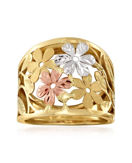 Ross-Simons is the authority on luxury classics. A vision of floral beauty! This Italian-made ring showcases an openwork floral design of textured and polished 14kt yellow gold with 14kt white and rose gold flower accents. You'll dream of spring all year long when you don this ring. 3/8" wide. 14kt tri-colored gold floral ring. Each Ross-Simons item arrives in a fine jewelry presentation box. Shop Ross-Simons jewelry risk-free as all items include a 30-day, 100% money-back guarantee.