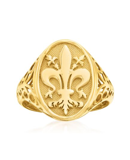 Ross-Simons presents contemporary styles with a timeless appeal. Representing perfection and light, the fleur-de-lis symbol gleams in textured and polished 14kt yellow gold in this signet ring. With its ornate detailing, it's a choice fit for royalty! Made in Italy. 5/8" wide. 14kt yellow gold fleur-de-lis signet ring. Each Ross-Simons item arrives in a fine jewelry presentation box. Shop Ross-Simons jewelry risk-free as all items include a 30-day, 100% money-back guarantee.