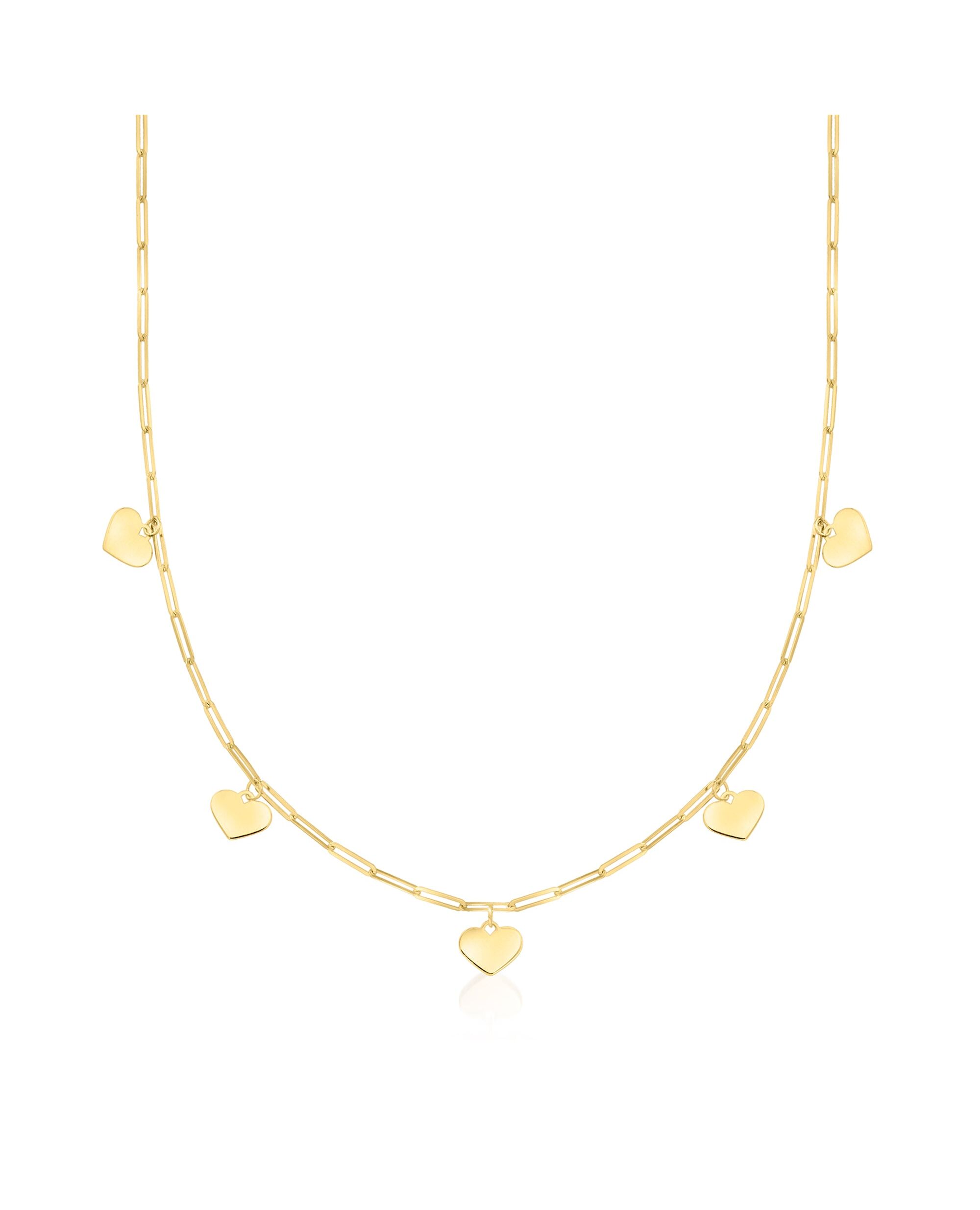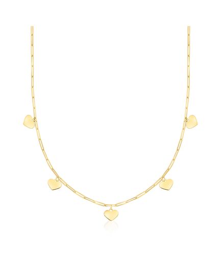 Ross-Simons is always looking for new ways to reinvent essential jewelry styles. RS Pure. Modern designs that complete your outfit and complement your personality. From Italy, this sweet station necklace will lighten up any layered look with its charming spirit. Finely crafted in polished 14kt yellow gold, an on-trend paper clip link necklace is adorned with petite heart charms that are polished to a glossy finish. Springring clasp, 14kt yellow gold heart charm paper clip link necklace. Each Ross-Simons item arrives in a fine jewelry presentation box. Shop Ross-Simons jewelry risk-free as all items include a 30-day, 100% money-back guarantee.