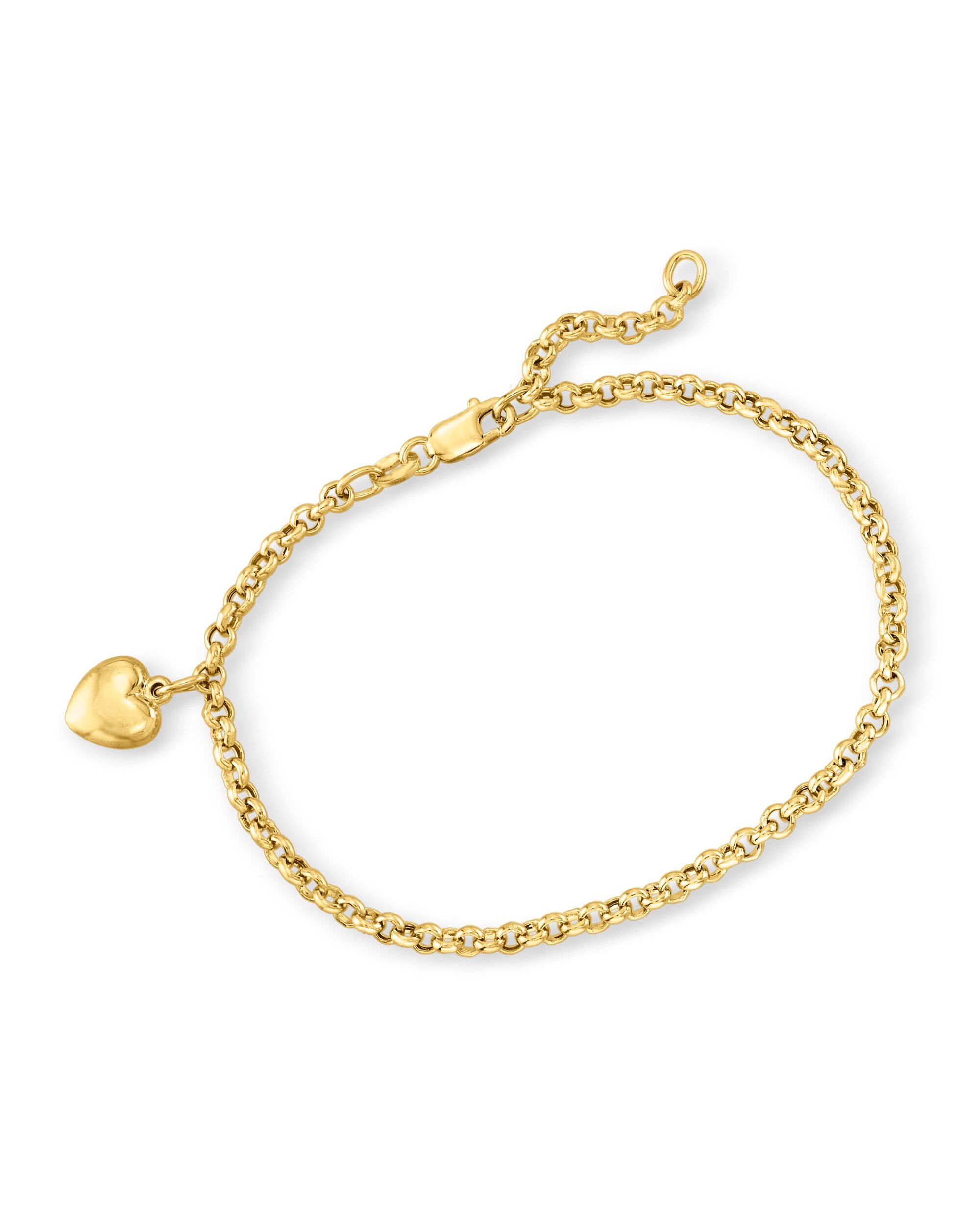 Established in 1952, Ross-Simons presents contemporary styles with a timeless appeal. A charming design with a touch of romance! This Italian-made bracelet glows in polished 18kt yellow gold with a heart charm. Rolo chain with a 3/4" extender. Lobster clasp, 18kt yellow gold heart charm bracelet. Charm length - 3/8 inch long. Charm width - 5/16 inch wide. Each Ross-Simons item arrives in a fine jewelry presentation box. Shop Ross-Simons jewelry risk-free as all items include a 30-day, 100% money-back guarantee.
