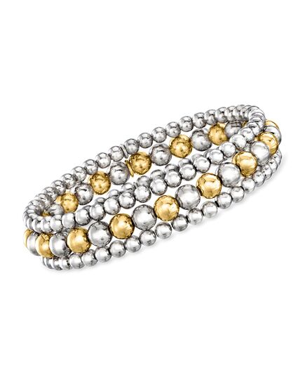 A top-rated jeweler since 1952, Ross-Simons travels the world to find high-quality styles at the best prices. You can never go wrong by adding a little more shine! Perfect for customizing your look anytime, this Italian-made set features three stretch bracelets with 4-6mm beads of sterling silver and 18kt yellow gold over sterling silver. Worn together or apart, they're always an easy pick-me-up for your wardrobe. Slip-on, two-tone sterling silver bead stretch bracelet set. Each Ross-Simons item arrives in a fine jewelry presentation box. Shop Ross-Simons jewelry risk-free as all items include a 30-day, 100% money-back guarantee.