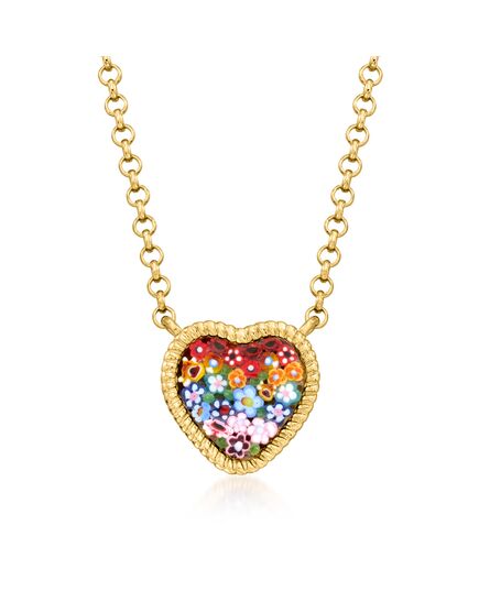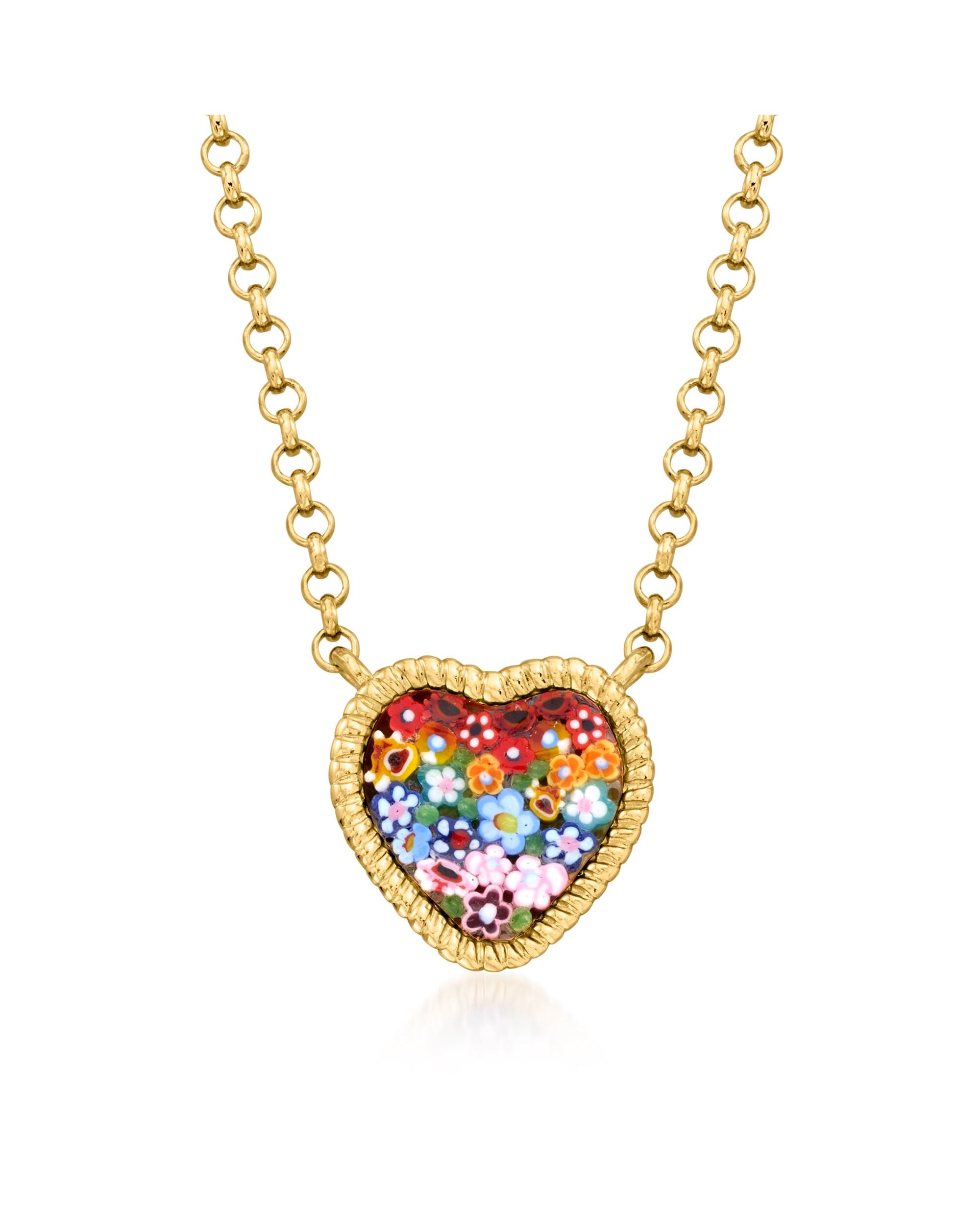 Ross-Simons Italian Multicolored Murano Glass Mosaic Floral Heart Necklace in 18kt Gold Over Sterling