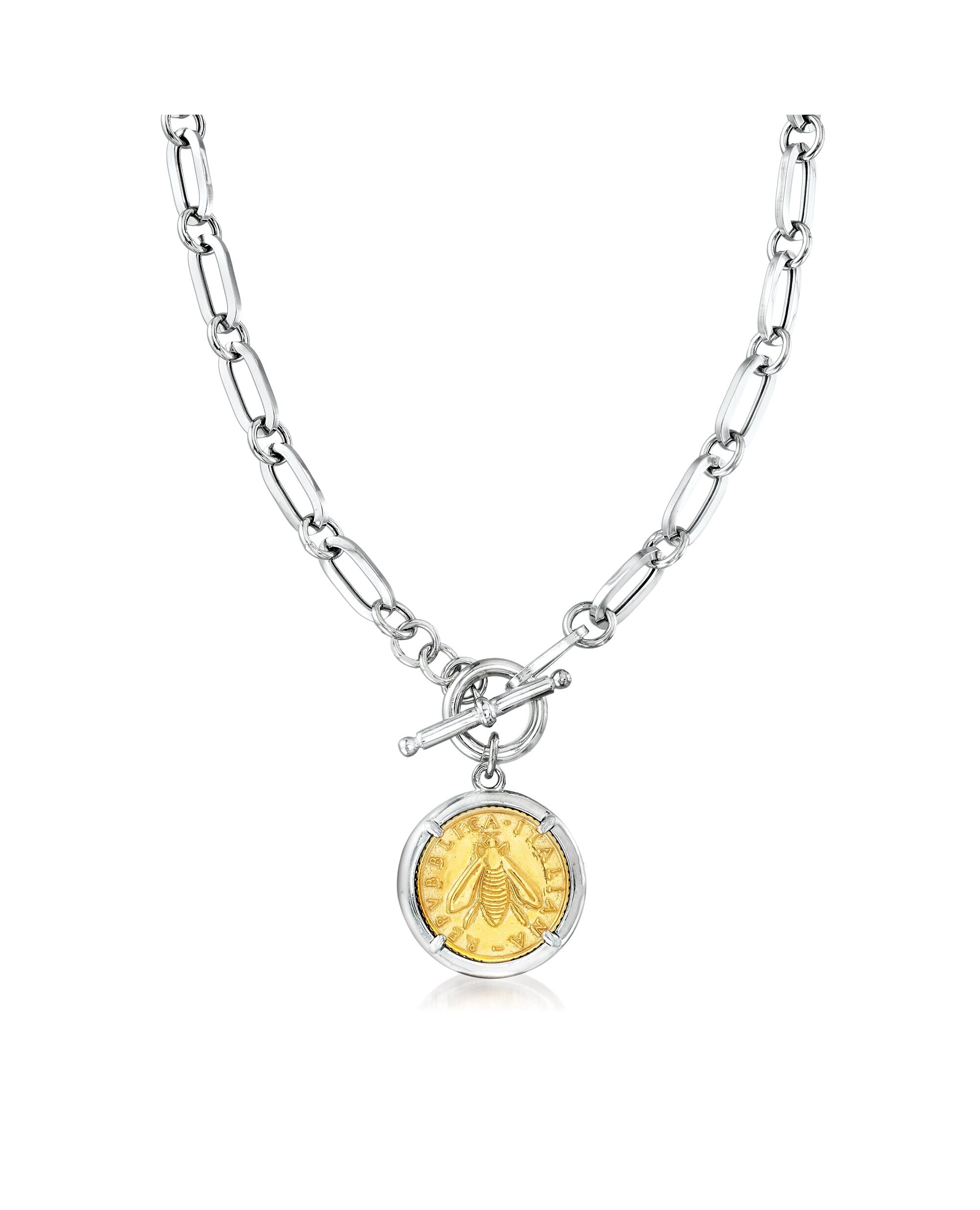 Ross-Simons Italian Replica Bee Lira Coin Necklace in Sterling Silver and 18kt Gold Over Sterling