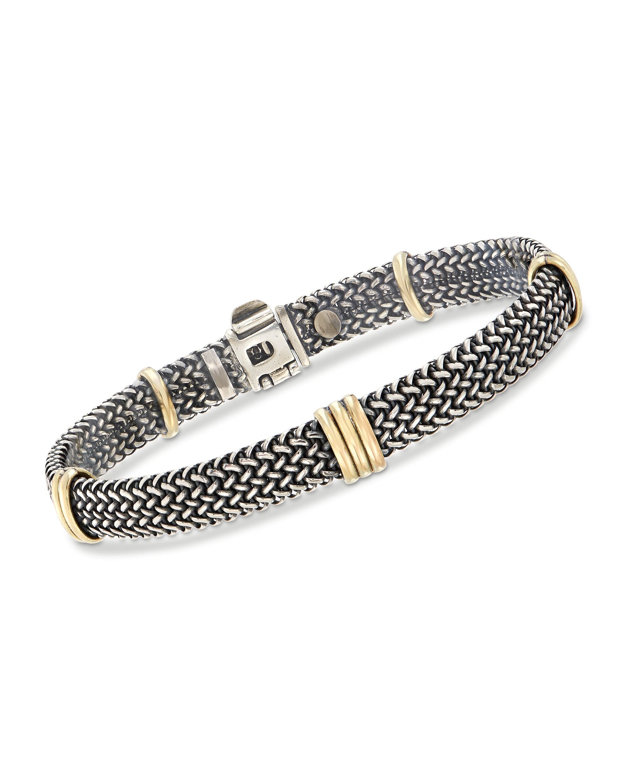 Established in 1952, Ross-Simons presents contemporary styles with a timeless appeal. An RS exclusive. Woven sterling silver is triple-spaced with bars of polished 18kt bonded gold in this striking Italian bracelet. Measures 3/8" in width. Made in Italy. Foldover clasp, sterling silver and 18kt bonded gold bracelet. Each Ross-Simons item arrives in a fine jewelry presentation box. Shop Ross-Simons jewelry risk-free as all items include a 30-day, 100% money-back guarantee.