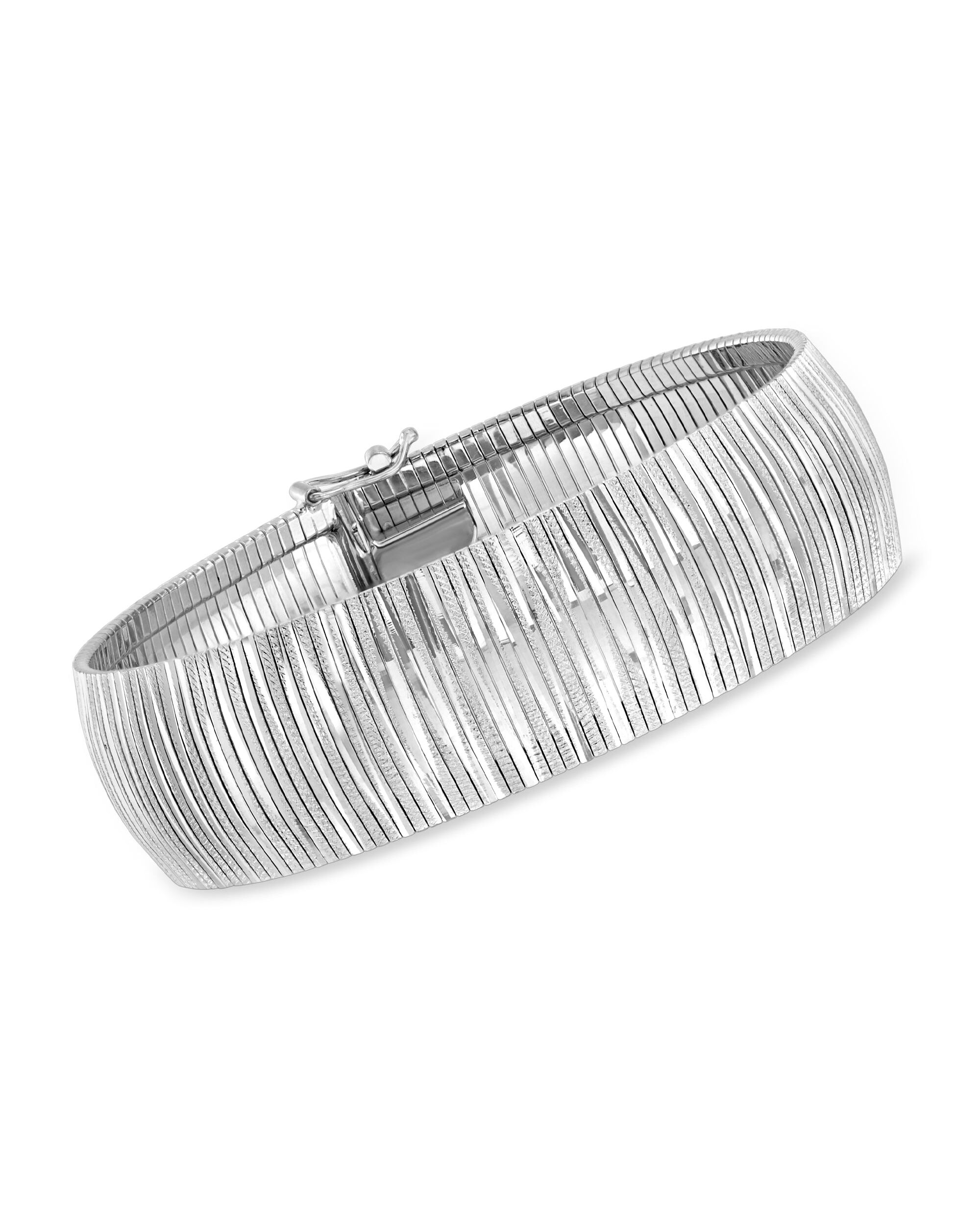 Ross-Simons presents contemporary styles with a timeless appeal. Our Italian-made, gleaming omega-style bracelet is an absolute classic. Masterfully crafted in polished and textured sterling silver, the sophisticated style features a striped pattern and subtle curved design all the way around. Sure to be noticed for its sleek and timeless look, this affordable luxury will become a favorite of yours for years to come. 3/4" wide. Figure 8 safety. Box clasp, sterling silver omega-style bracelet. Each Ross-Simons item arrives in a fine jewelry presentation box. Shop Ross-Simons jewelry risk-free as all items include a 30-day, 100% money-back guarantee.