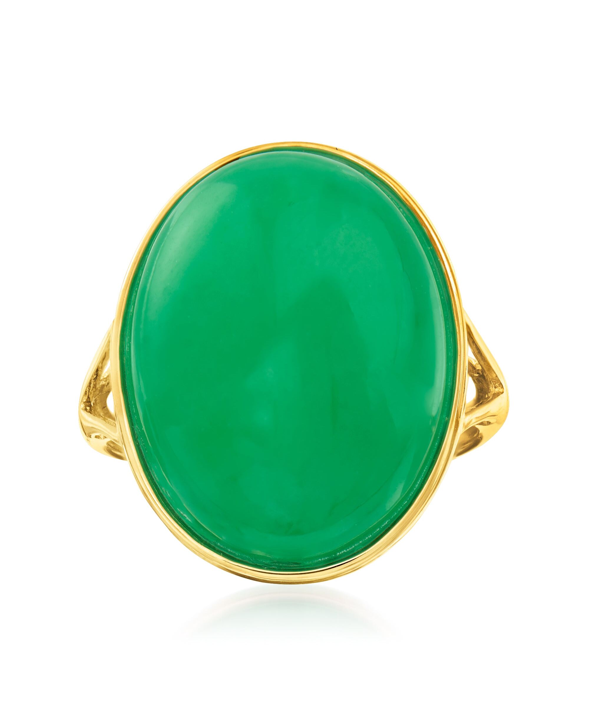 Established in 1952, Ross-Simons presents contemporary styles with a timeless appeal. Every jewelry box needs a touch of jade! This glossy statement ring showcases a fabulous 15x20mm oval jade cabochon bursting with its signature green hue. Set in polished 14kt yellow gold on a unique open-space split shank. 3/4" wide. Jade ring. Each Ross-Simons item arrives in a fine jewelry presentation box. Shop Ross-Simons jewelry risk-free as all items include a 30-day, 100% money-back guarantee.Stone InformationGem Type 1 - JadeStone Cut 1 - CabochonStone Color 1 - GreenStone Clarity 1 - GreenStone Shape 1 - Oval-ShapeStone Creation Method 1 - NaturalStone Treatment Method 1 - Dyed, ImpregnatedStone Weight 1 - 0 CaratsNumber Of Stones 1 - 1