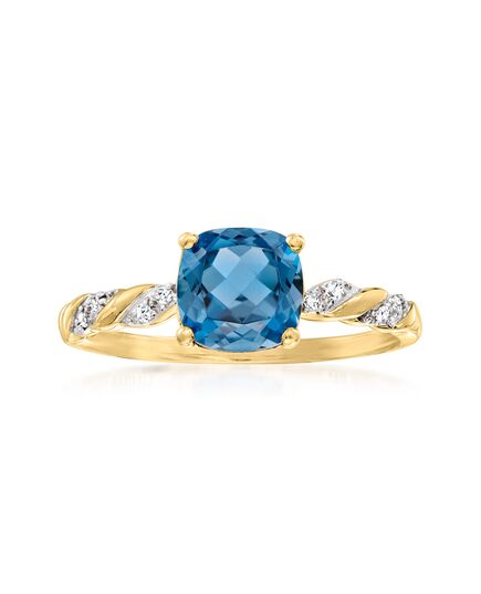 Ross-Simons is the authority on luxury classics. In this ring, a vividly hued 1.70 carat square cushion-cut London blue topaz gemstone is sparked by twists of diamond accents in white rhodium. Set in polished 14kt yellow gold. 1/4" wide. London blue topaz ring. Each Ross-Simons item arrives in a fine jewelry presentation box. Shop Ross-Simons jewelry risk-free as all items include a 30-day, 100% money-back guarantee.Stone InformationGem Type 1 - TopazStone Cut 1 - Good-CutStone Color 1 - BlueStone Clarity 1 - BlueStone Shape 1 - Square-ShapeStone Creation Method 1 - NaturalStone Treatment Method 1 - Heat-Treated,IrradiatedStone Weight 1 - 1.70 CaratsNumber Of Stones 1 - 1Gem Type 2 - DiamondStone Cut 2 - Good-CutStone Color 2 - H-IStone Clarity 2 - I2Stone Shape 2 - Round-ShapeStone Creation Method 2 - NaturalStone Treatment Method 2 - Not-TreatedStone Weight 2 - 0.03 CaratsNumber Of Stones 2 - 8