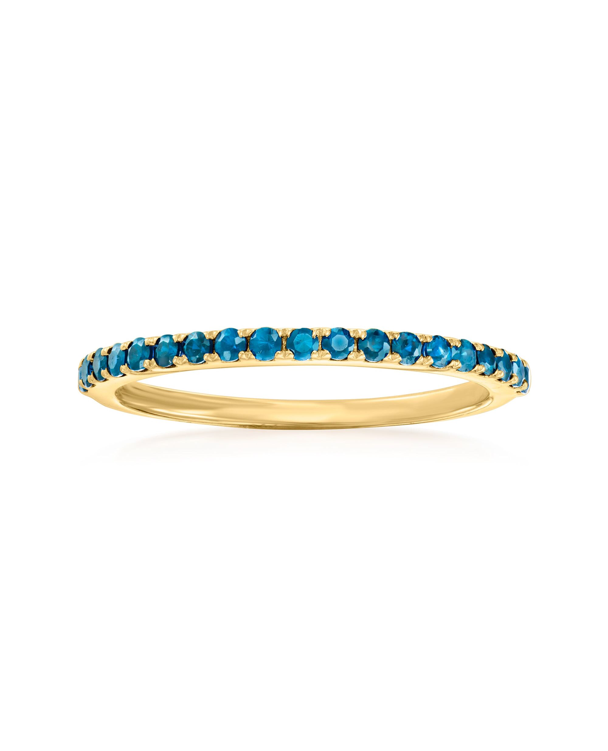 Established in 1952, Ross-Simons presents contemporary styles with a timeless appeal. RS Pure. Create the perfect stackable look with simple, modern jewelry. This small ring showcases 0.30 ct. t.w. London blue topaz rounds in polished 14kt yellow gold. 1/16" wide. Blue topaz ring. Each Ross-Simons item arrives in a fine jewelry presentation box. Shop Ross-Simons jewelry risk-free as all items include a 30-day, 100% money-back guarantee.Stone InformationGem Type 1 - TopazStone Cut 1 - Good-CutStone Color 1 - BlueStone Clarity 1 - BlueStone Shape 1 - Round-ShapeStone Creation Method 1 - NaturalStone Treatment Method 1 - Heat-Treated,IrradiatedStone Weight 1 - 0.30 CaratsNumber Of Stones 1 - 19
