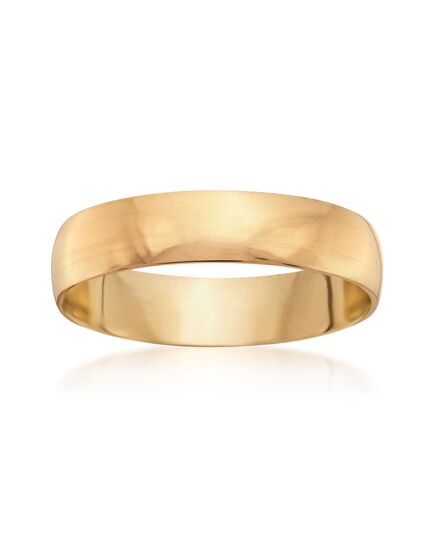 Developing fresh ways to wear timeless looks, Ross-Simons masters the classics. Refined yet substantial at 5mm in width, this elegant wedding ring is one he'll cherish for a lifetime. The golden ring gleams in unadorned masculinity, as unlined as the happy years that lie ahead. Polished 14kt yellow gold wedding ring. Each Ross-Simons item arrives in a fine jewelry presentation box. Shop Ross-Simons jewelry risk-free as all items include a 30-day, 100% money-back guarantee.