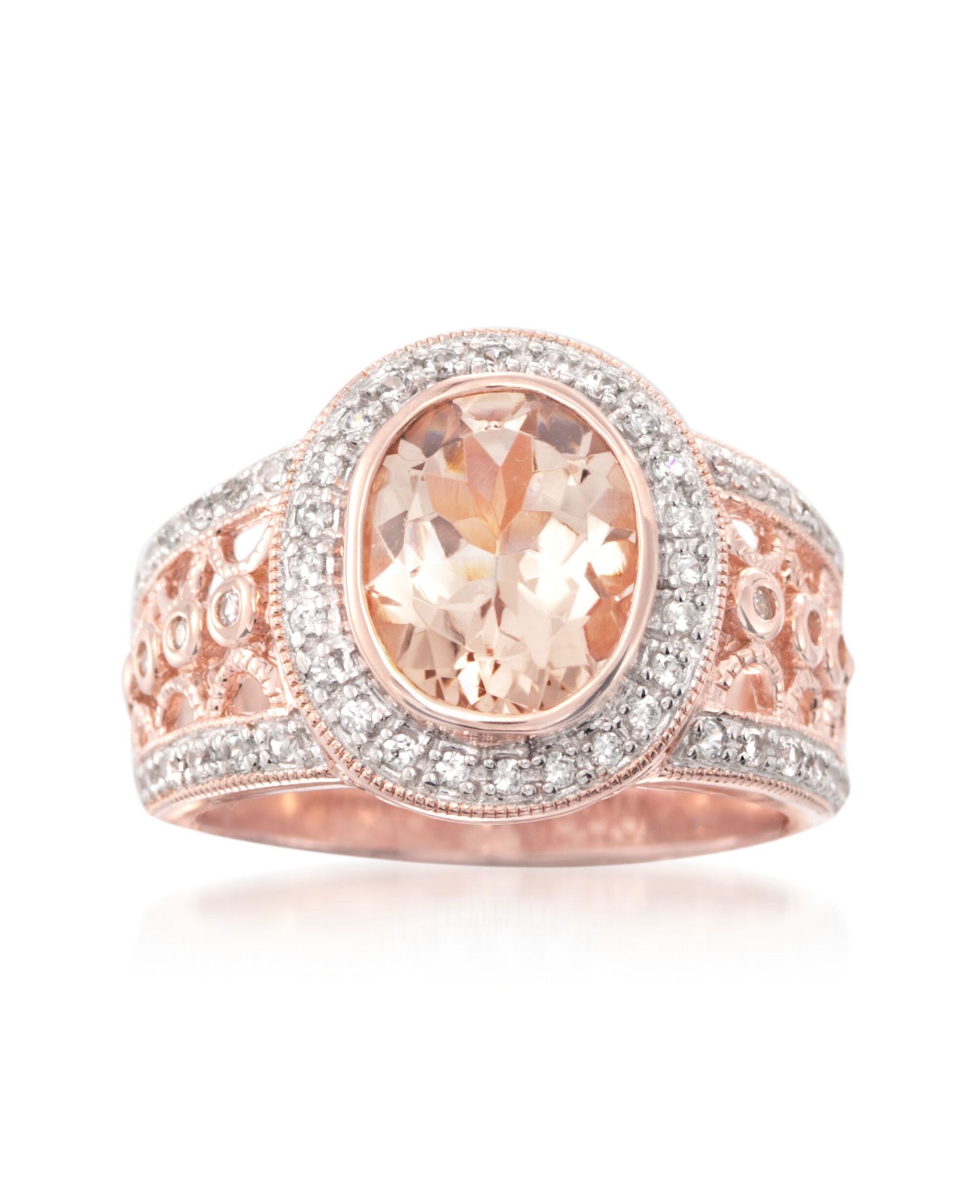 A top-rated jeweler since 1952, Ross-Simons travels the world to find high-quality styles at the best prices. Drawing inspiration from both vintage and contemporary design, this ring will satisfy your craving for something fresh and sparkly. A 2.30 carat oval morganite is the star of the show, glowing in a frame of white zircons. The band is patterned with an open circle design, also sprinkled with white zircons. Total zircon weight is .40 carats. 18kt rose gold over sterling silver ring. Each Ross-Simons item arrives in a fine jewelry presentation box. Shop Ross-Simons jewelry risk-free as all items include a 30-day, 100% money-back guarantee.Stone InformationGem Type 1 - MorganiteStone Cut 1 - Good-CutStone Color 1 - PinkStone Clarity 1 - PinkStone Shape 1 - Oval-ShapeStone Creation Method 1 - NaturalStone Treatment Method 1 - HeatedStone Weight 1 - 2.29 CaratsNumber Of Stones 1 - 1Gem Type 2 - ZirconStone Cut 2 - Good-CutStone Color 2 - WhiteStone Clarity 2 - WhiteStone Shape 2 - Round-ShapeStone Creation Method 2 - NaturalStone Treatment Method 2 - Heat-TreatedStone Weight 2 - 0.40 CaratsNumber Of Stones 2 - 54
