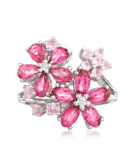 Established in 1952, Ross-Simons presents contemporary styles with a timeless appeal. Presenting a floral bouquet that will never fade away! This blushing ring features 2.80 ct. t.w. oval and pear-shaped pink topaz and .43 ct. t.w. round pink sapphires that form flowers along with sparkling diamond accents. Set in polished sterling silver. 3/4" wide. Multi-gemstone flower ring. Each Ross-Simons item arrives in a fine jewelry presentation box. Shop Ross-Simons jewelry risk-free as all items include a 30-day, 100% money-back guarantee.Stone InformationGem Type 1 - SapphireStone Cut 1 - Good-CutStone Color 1 - PinkStone Clarity 1 - PinkStone Shape 1 - Round-ShapeStone Creation Method 1 - NaturalStone Treatment Method 1 - HeatedStone Weight 1 - 0.43 CaratsNumber Of Stones 1 - 10Gem Type 2 - TopazStone Cut 2 - Good-CutStone Color 2 - PinkStone Clarity 2 - PinkStone Shape 2 - Pear-ShapeStone Creation Method 2 - NaturalStone Treatment Method 2 - Heat-Treated,IrradiatedStone Weight 2 - 1.40 CaratsNumber Of Stones 2 - 5Gem Type 3 - TopazStone Cut 3 - Good-CutStone Color 3 - H-IStone Clarity 3 - I1Stone Shape 3 - Oval-ShapeStone Creation Method 3 - NaturalStone Treatment Method 3 - Heat-Treated,IrradiatedStone Weight 3 - 1.40 CaratsNumber Of Stones 3 - 5Gem Type 4 - DiamondStone Cut 4 - Good-CutStone Color 4 - H-IStone Clarity 4 - I2Stone Shape 4 - Round-ShapeStone Creation Method 4 - NaturalStone Treatment Method 4 - Not-TreatedStone Weight 4 - 0.04 CaratsNumber Of Stones 4 - 2