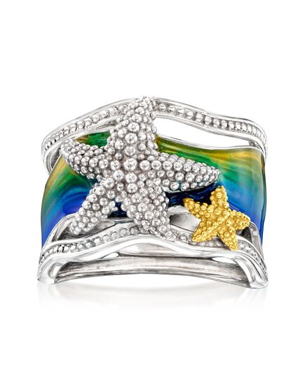 At Ross-Simons, we recognize the style power of versatile classics. In this ring, a wave of blue, green and yellow enamel acts as a backdrop for beaded sterling silver and 18kt yellow gold over sterling silver starfish. 1/2" wide. Multicolored enamel starfish ring. Each Ross-Simons item arrives in a fine jewelry presentation box. Shop Ross-Simons jewelry risk-free as all items include a 30-day, 100% money-back guarantee.