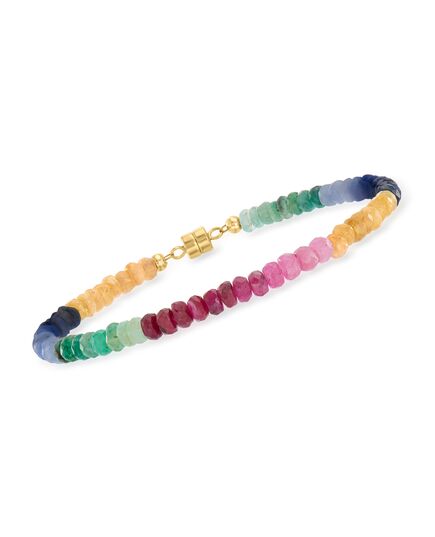 With a commitment to quality and affordability, Ross-Simons presents timeless jewelry for the modern woman. This eye-catching 25.00 ct. t.w. multicolored sapphire bead bracelet is fashionable and oh so fun! Featuring 65 rondelle faceted beads that create an ombre-inspired rainbow strand that will look fantastic year-round, but especially chic with a warmer-weather wardrobe. Finishes with a 14kt yellow gold magnetic clasp for easy on-and-off. Multicolored sapphire bead bracelet. Each Ross-Simons item arrives in a fine jewelry presentation box. Shop Ross-Simons jewelry risk-free as all items include a 30-day, 100% money-back guarantee.Stone InformationGem Type 1 - SapphireStone Cut 1 - Good-CutStone Color 1 - Multiple-ColorsStone Clarity 1 - Multiple-ColorsStone Shape 1 - Special-Cut-ShapeStone Creation Method 1 - NaturalStone Treatment Method 1 - HeatedStone Weight 1 - 25.00 CaratsNumber Of Stones 1 - 65