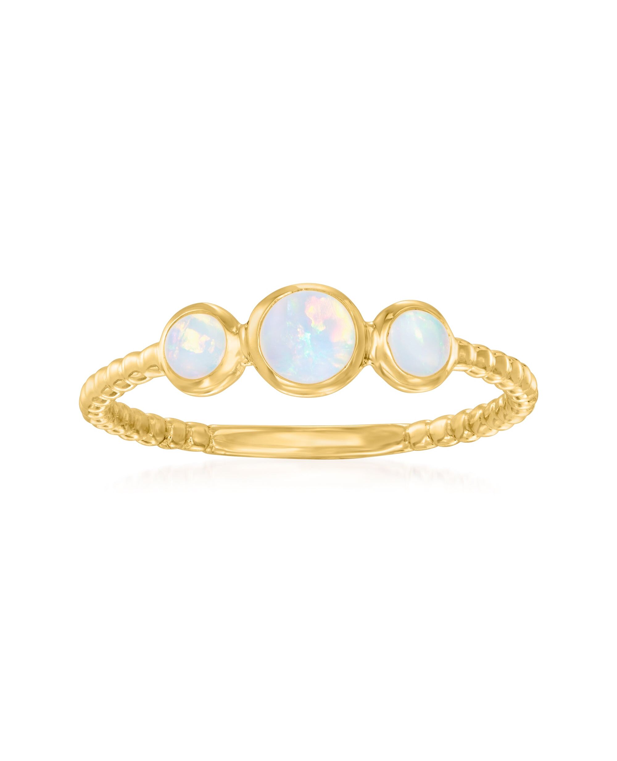 Established in 1952, Ross-Simons presents contemporary styles with a timeless appeal. Dreamy opal times three! On this simple yet ultra-chic design, a 14kt yellow gold bead-style shank is centered by a trio of 3-4mm round opals, flashing their signature iridescence that will catch the light beautifully. 3/16" wide. Opal ring. Each Ross-Simons item arrives in a fine jewelry presentation box. Shop Ross-Simons jewelry risk-free as all items include a 30-day, 100% money-back guarantee.Stone InformationGem Type 1 - OpalStone Cut 1 - Good-CutStone Color 1 - WhiteStone Clarity 1 - WhiteStone Shape 1 - Round-ShapeStone Creation Method 1 - NaturalStone Treatment Method 1 - ImpregnatedStone Weight 1 - 0 CaratsNumber Of Stones 1 - 3
