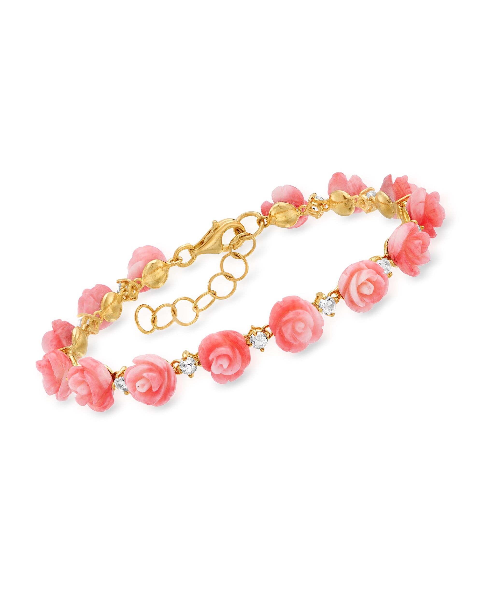 Ross-Simons Pink Coral and White Topaz Rose Bracelet in 18kt Gold Over Sterling