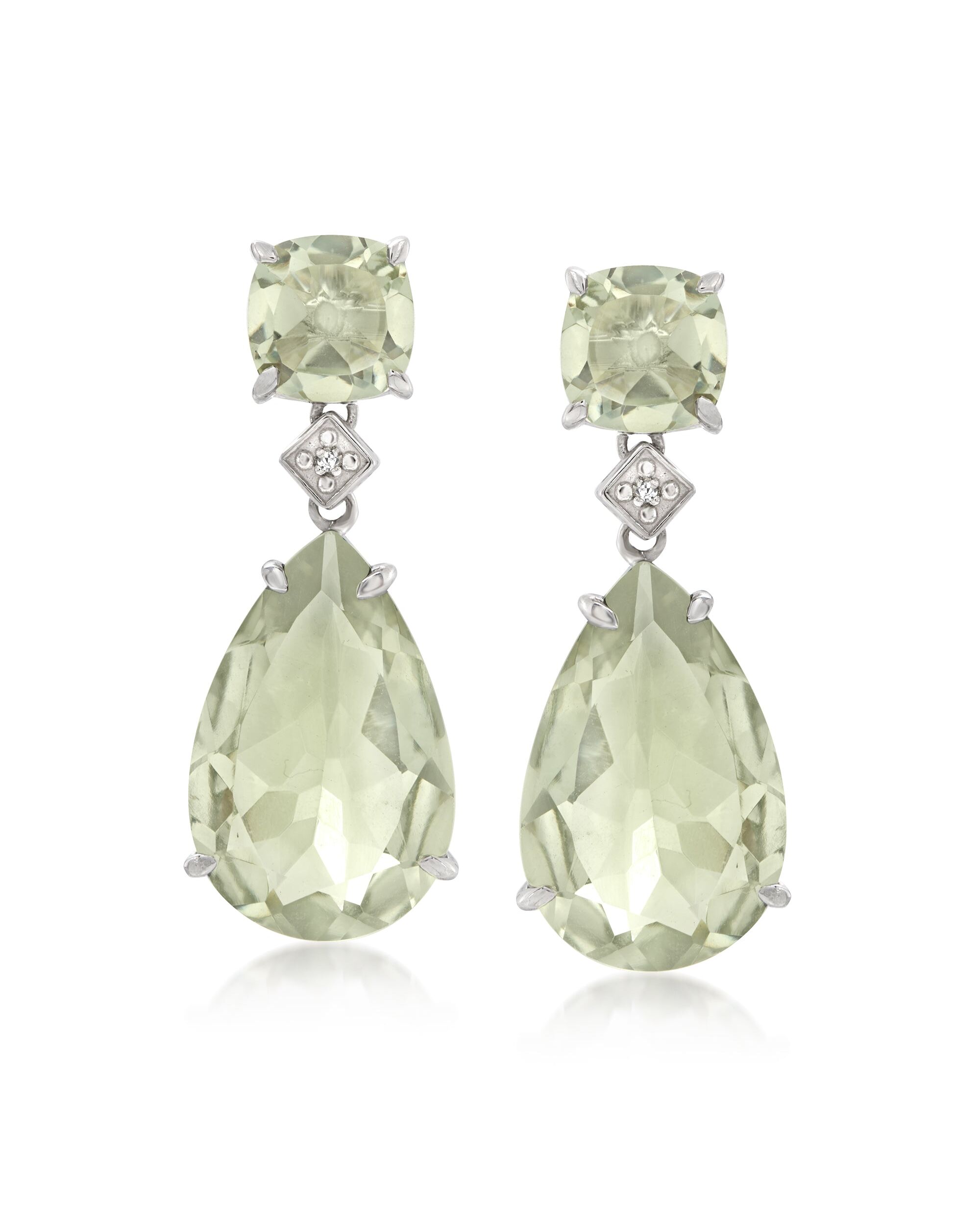 Ross-Simons is always looking for new ways to reinvent essential jewelry styles. Glamorous pastel green gems will illuminate your face from ear to ear! On this pair, 21.60 ct. t.w. square cushion-cut and pear-shaped prasiolites glimmer a verdant glow, sparked by diamond accents and set in polished sterling silver. Hanging length is 1 1/8". Post/clutch, prasiolite drop earrings. Each Ross-Simons item arrives in a fine jewelry presentation box. Shop Ross-Simons jewelry risk-free as all items include a 30-day, 100% money-back guarantee.Stone InformationGem Type 1 - Prasiolite-QuartzStone Cut 1 - Good-CutStone Color 1 - GreenStone Clarity 1 - GreenStone Shape 1 - Pear-ShapeStone Creation Method 1 - NaturalStone Treatment Method 1 - IrradiatedStone Weight 1 - 18.00 CaratsNumber Of Stones 1 - 2Gem Type 2 - Prasiolite-QuartzStone Cut 2 - Good-CutStone Color 2 - GreenStone Clarity 2 - GreenStone Shape 2 - Square-ShapeStone Creation Method 2 - NaturalStone Treatment Method 2 - IrradiatedStone Weight 2 - 3.60 CaratsNumber Of Stones 2 - 2Gem Type 3 - DiamondStone Cut 3 - Good-CutStone Color 3 - G-HStone Clarity 3 - I2Stone Shape 3 - Round-ShapeStone Creation Method 3 - NaturalStone Treatment Method 3 - Not-TreatedStone Weight 3 - 0.03 CaratsNumber Of Stones 3 - 2