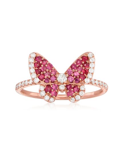 A top-rated jeweler since 1952, Ross-Simons travels the world to find high-quality styles at the best prices. Celebrate how far you've come with this beautiful symbol of transformation! Our fluttery butterfly ring is bedecked with 0.86 ct. t.w. round rubies and iced in .30 ct. t.w. round brilliant-cut diamonds. Set in polished 14kt rose gold to complete the fresh feminine look. Would also make a wonderful gift for any woman who's helped or encouraged you to spread your wings and fly. 3/8" wide. Diamond and ruby butterfly ring. Each Ross-Simons item arrives in a fine jewelry presentation box. Shop Ross-Simons jewelry risk-free as all items include a 30-day, 100% money-back guarantee.Stone InformationGem Type 1 - RubyStone Cut 1 - Good-CutStone Color 1 - RedStone Clarity 1 - RedStone Shape 1 - Round-ShapeStone Creation Method 1 - NaturalStone Treatment Method 1 - Heat-TreatedStone Weight 1 - 0.86 CaratsNumber Of Stones 1 - 28Gem Type 2 - DiamondStone Cut 2 - Good-CutStone Color 2 - G-HStone Clarity 2 - I1Stone Shape 2 - Round-ShapeStone Creation Method 2 - NaturalStone Treatment Method 2 - Not-TreatedStone Weight 2 - 0.30 CaratsNumber Of Stones 2 - 38