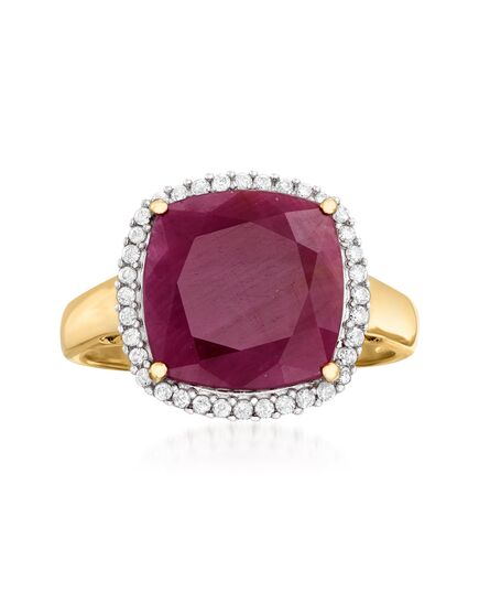 Developing fresh ways to wear timeless looks, Ross-Simons masters the classics. Set in polished 14kt yellow gold, this gorgeous ring showcases a 6.30 carat square cushion-cut ruby illuminated by .16 ct. t.w. round brilliant-cut diamonds in white rhodium. 1/2" wide. Diamond and ruby ring. Each Ross-Simons item arrives in a fine jewelry presentation box. Shop Ross-Simons jewelry risk-free as all items include a 30-day, 100% money-back guarantee.Stone InformationGem Type 1 - RubyStone Cut 1 - Good-CutStone Color 1 - RedStone Clarity 1 - RedStone Shape 1 - Square-ShapeStone Creation Method 1 - NaturalStone Treatment Method 1 - Heat-TreatedStone Weight 1 - 6.30 CaratsNumber Of Stones 1 - 1Gem Type 2 - DiamondStone Cut 2 - Good-CutStone Color 2 - I-JStone Clarity 2 - I2Stone Shape 2 - Round-ShapeStone Creation Method 2 - NaturalStone Treatment Method 2 - Not-TreatedStone Weight 2 - 0.16 CaratsNumber Of Stones 2 - 36