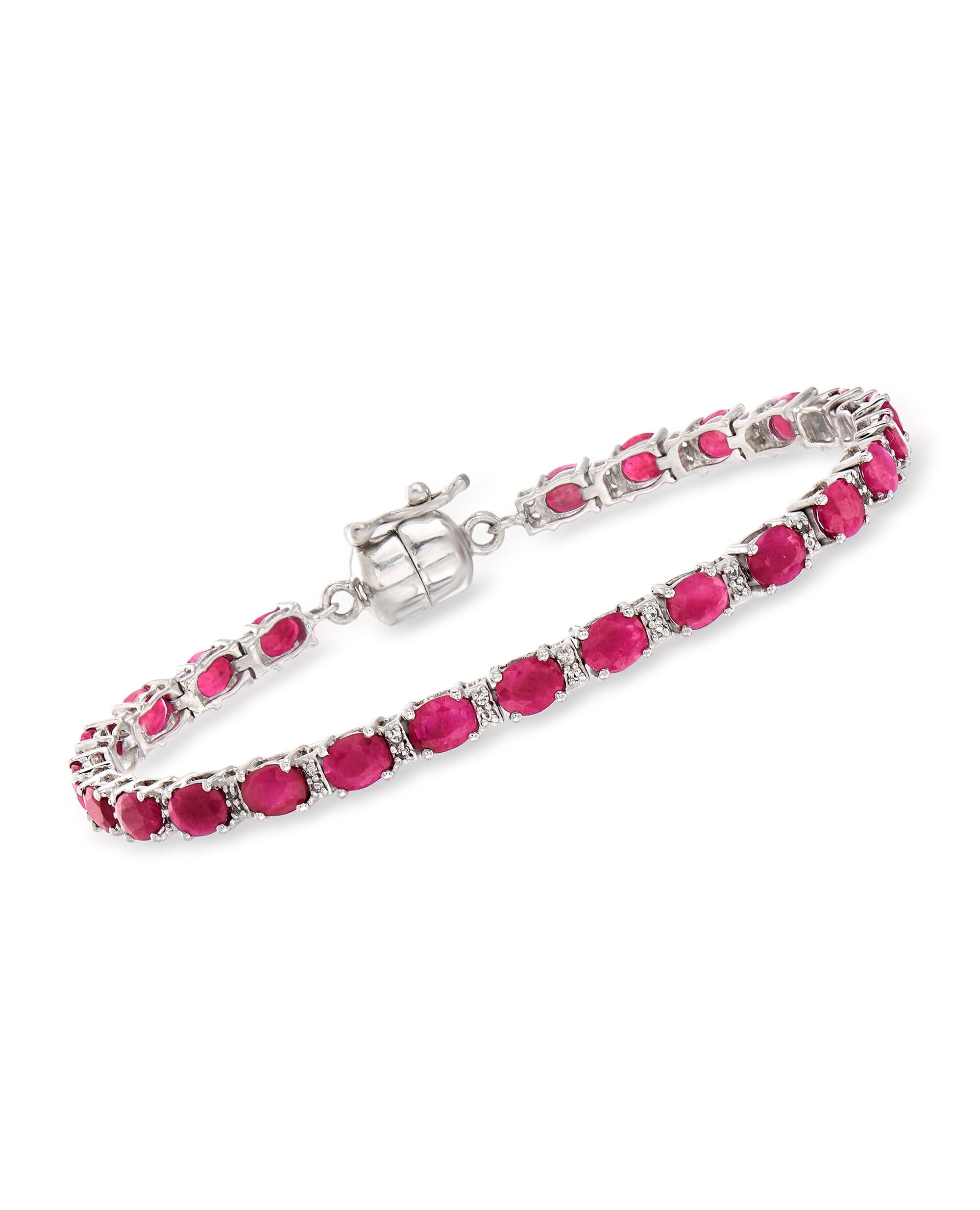 Ross-Simons travels the world to find beautiful, high-quality styles at the best prices. The classic tennis bracelet gets a colorful update in polished sterling silver. An alluring look, 7.00 ct. t.w. oval rubies with .20 ct. t.w. white topaz details make for an everyday accessory. Figure 8 safety. Magnetic clasp, white topaz and ruby tennis bracelet. Each Ross-Simons item arrives in a fine jewelry presentation box. Shop Ross-Simons jewelry risk-free as all items include a 30-day, 100% money-back guarantee.Stone InformationGem Type 1 - RubyStone Cut 1 - Good-CutStone Color 1 - RedStone Clarity 1 - RedStone Shape 1 - Oval-ShapeStone Creation Method 1 - NaturalStone Treatment Method 1 - Heat-TreatedStone Weight 1 - 7.00-8.00 CaratsNumber Of Stones 1 - 24-27Gem Type 2 - TopazStone Cut 2 - Good-CutStone Color 2 - WhiteStone Clarity 2 - WhiteStone Shape 2 - Round-ShapeStone Creation Method 2 - NaturalStone Treatment Method 2 - Heat-Treated,IrradiatedStone Weight 2 - 0.20 CaratsNumber Of Stones 2 - 48-54